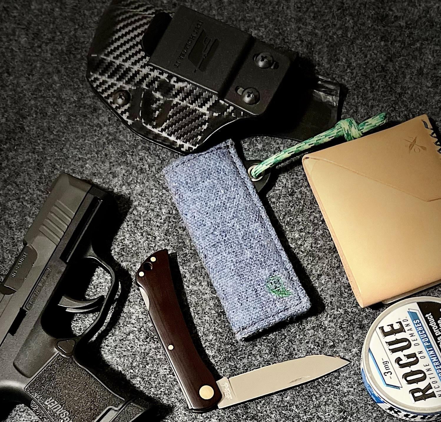Beard and Owl blue wool small slip, Sig P365, JHI lefty appendix holster, Open Seas bifold LT, Rogue peppermint 3mg, Boker Solingen RangeBuster N690.