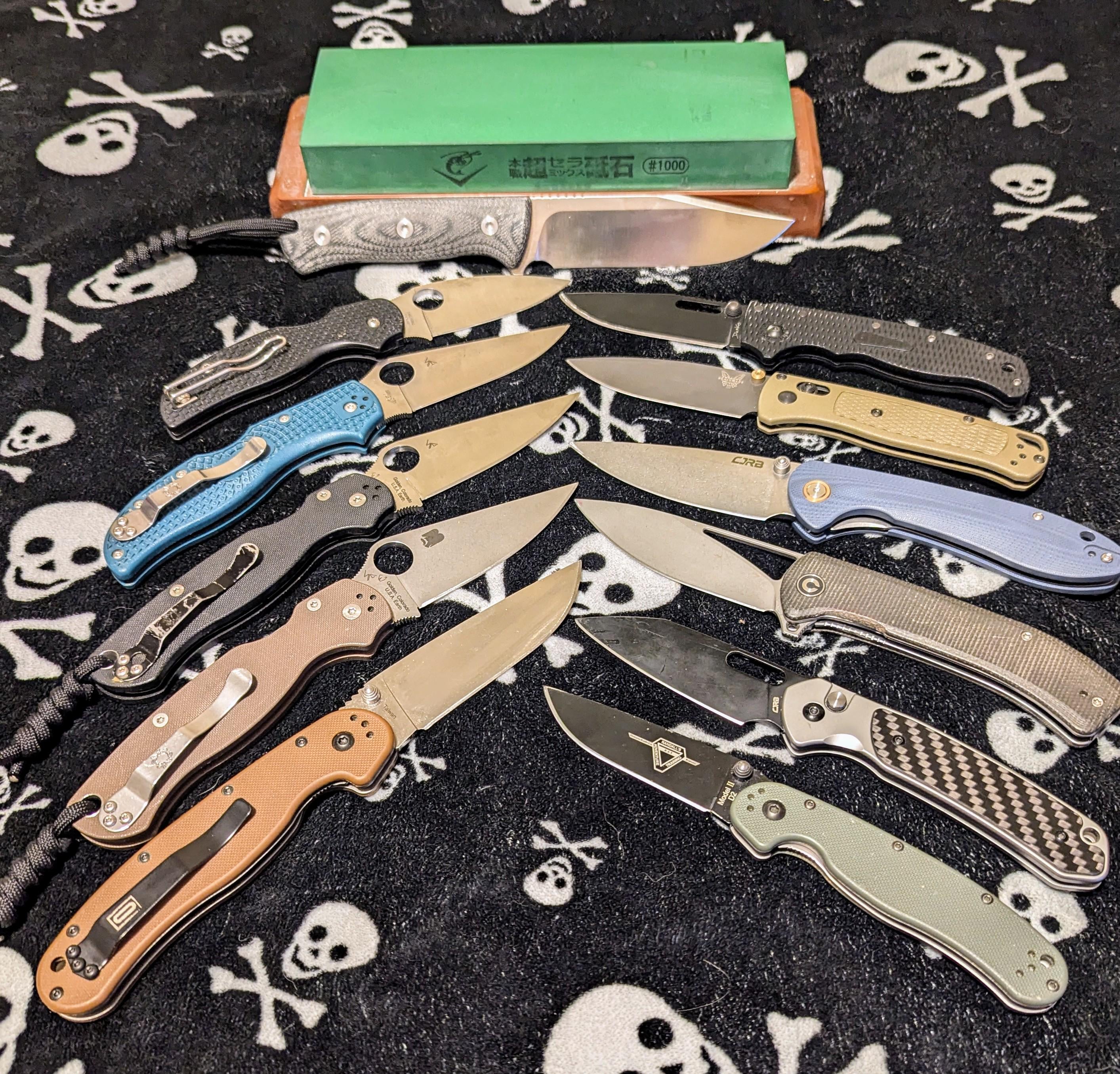Left: Spyderco Sage5 S30v, Spyderco Stretch2 K390, Spyderco Para2 S45VN, Spyderco Para2 15v, OKC Rat1 D2