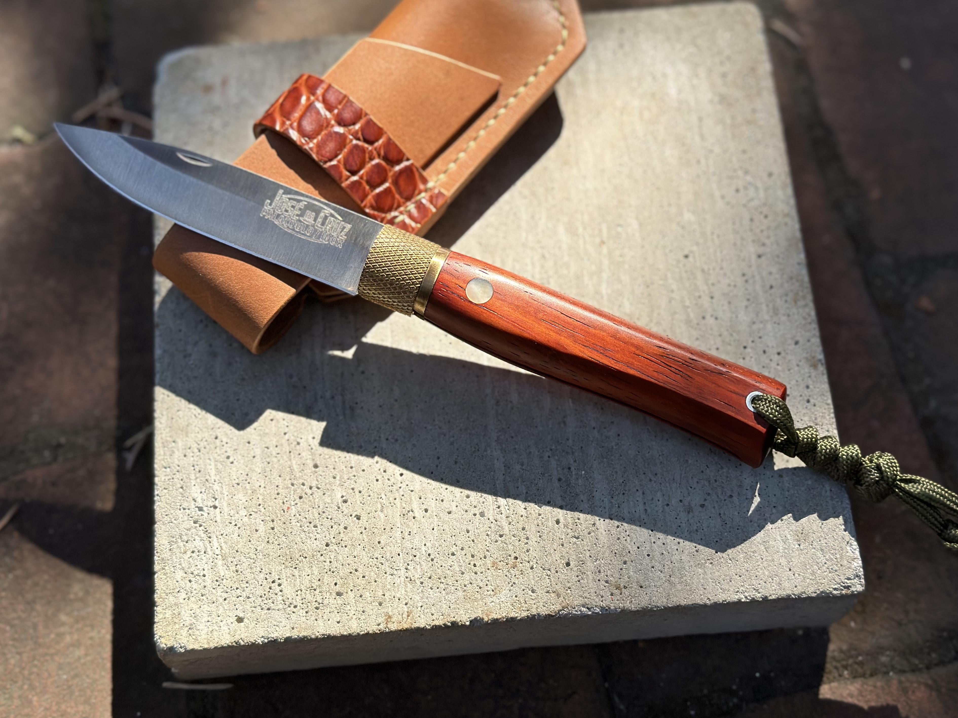 José Da Cruz large folder. If you like an Opinel, you will frickin LOVE José – he’s a rahhhther refined gentleman. Some beautiful wood choices (padauk pictured), beefy brass lock, wicked hollow grind, needle tip, and a solid build. This one got the treatment: gold abalone inlay, sanded, oiled, and waxed, brass collar brushed, spine chamfered and polished … full spa day. Horween Dublin and gator calf slip.
