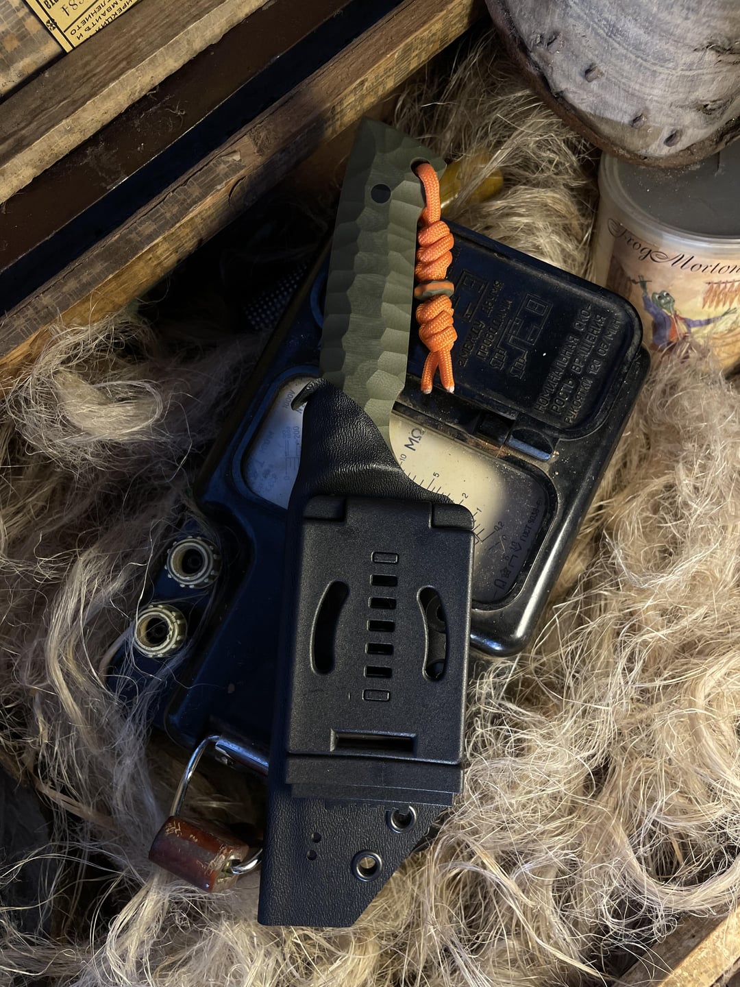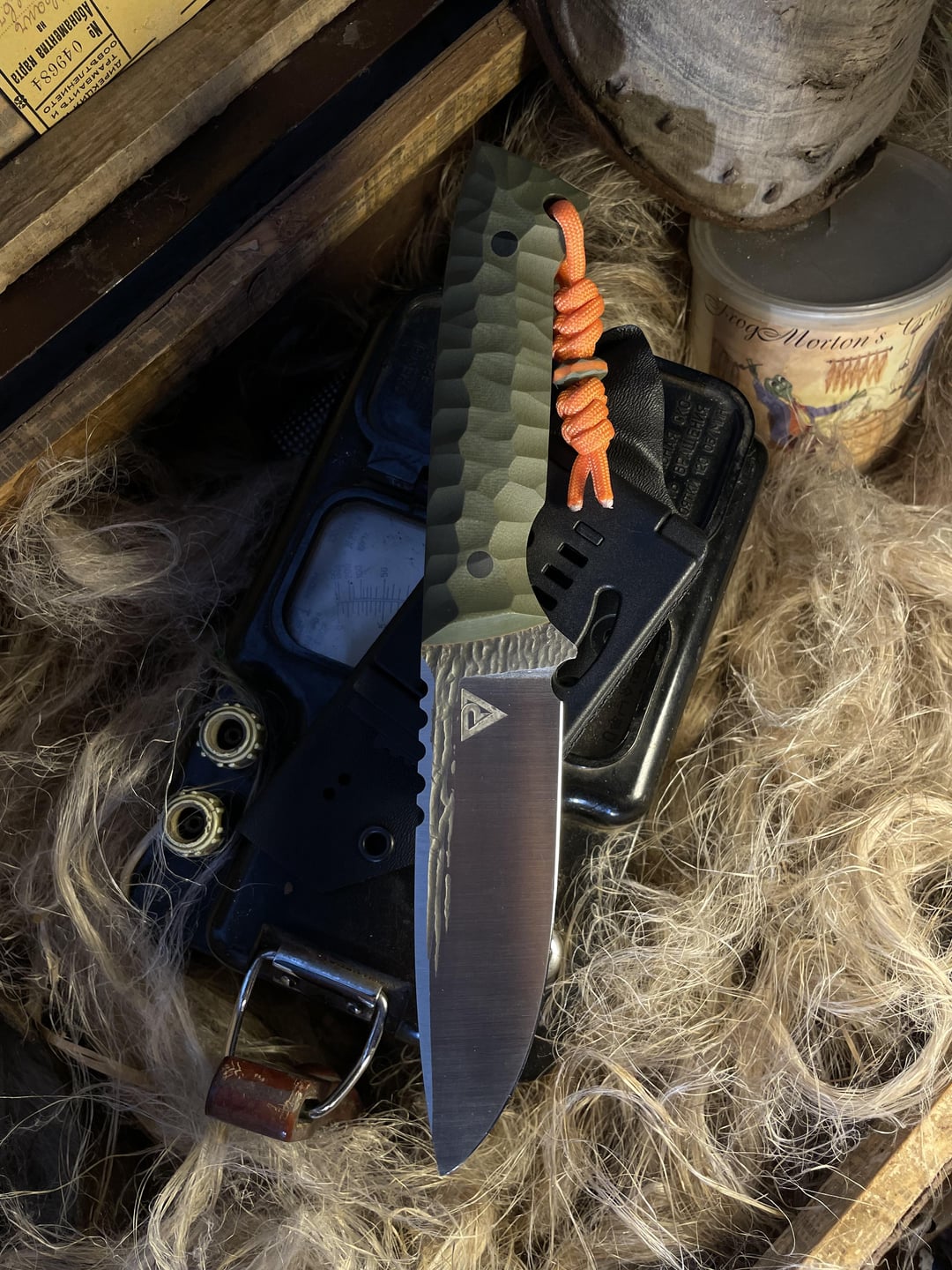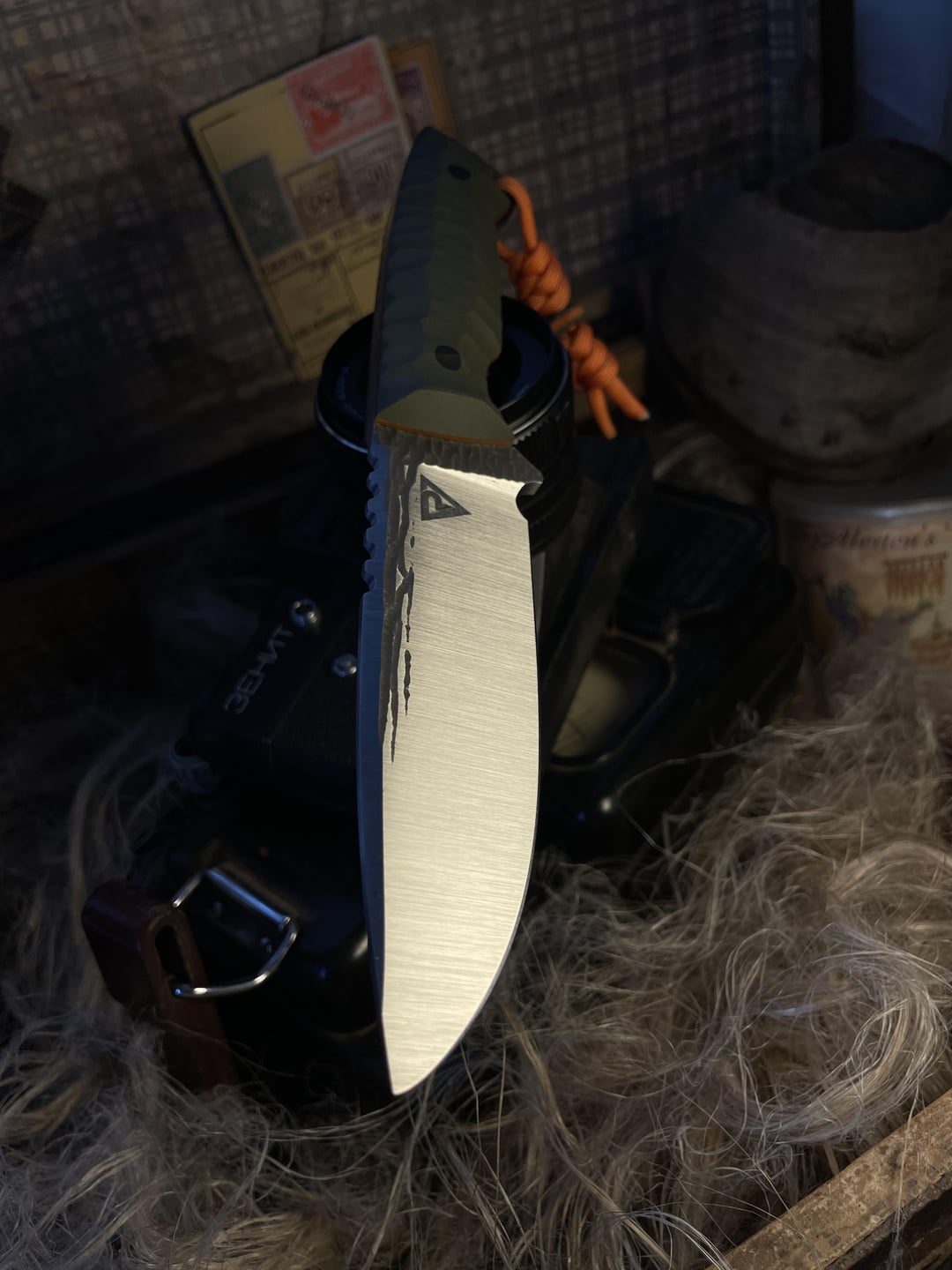 My latest work #24. Sandvik 14C28N at 61 HRC with cryo, two toned satin finish, OD green G10 scales and kydex sheath. Tell me what did you guys think of this?
