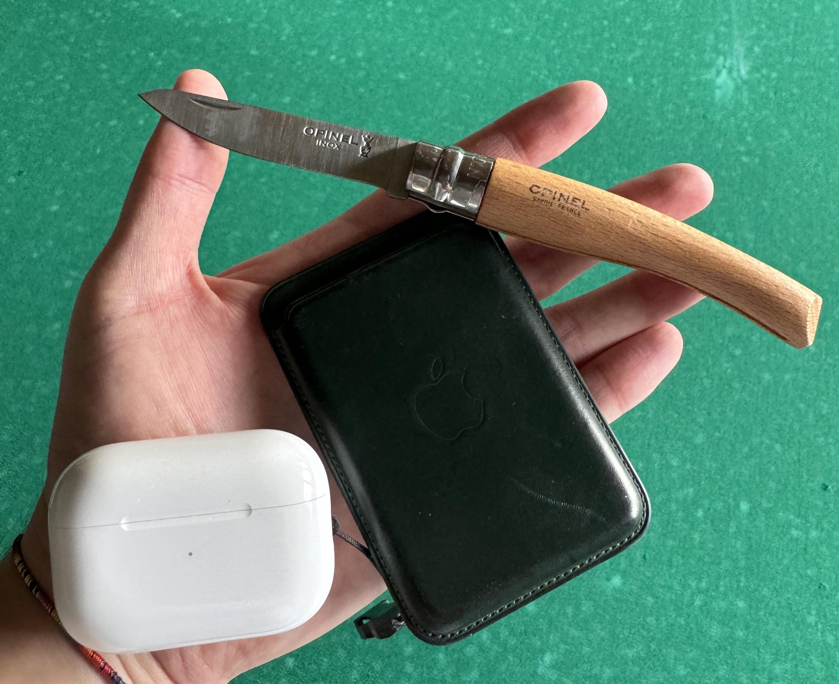 AirPods, Magsafe Card Wallet, Opinel No.8 Effilé (slightly changed tip)
