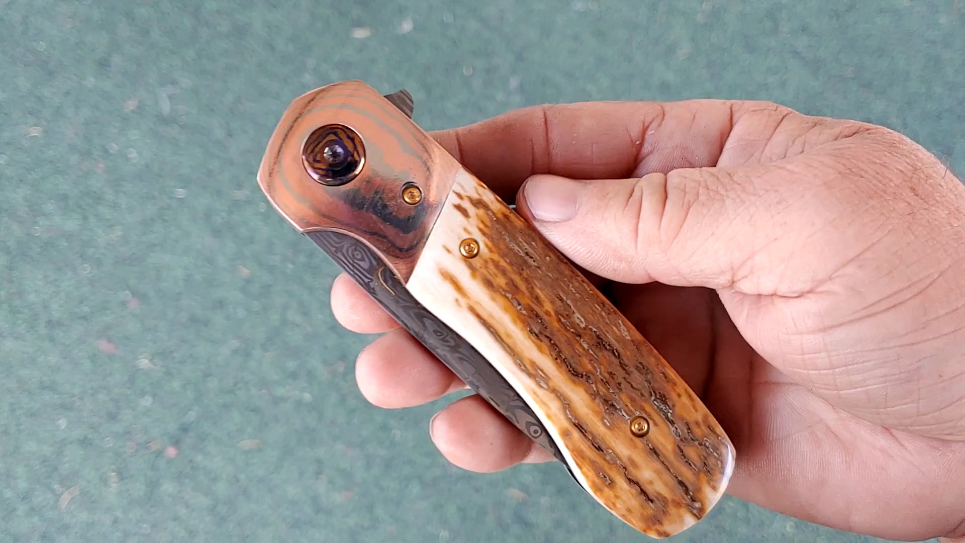 Mammoth ivory with a Damasteel blade and back spacer. Jeweled Ti liners for coolness. Gold plated screws and a Timascus pivot make this smooth as glass.