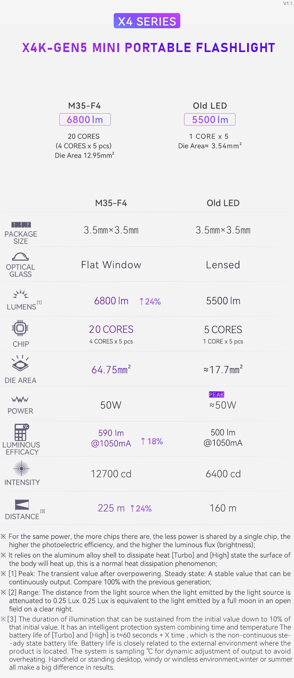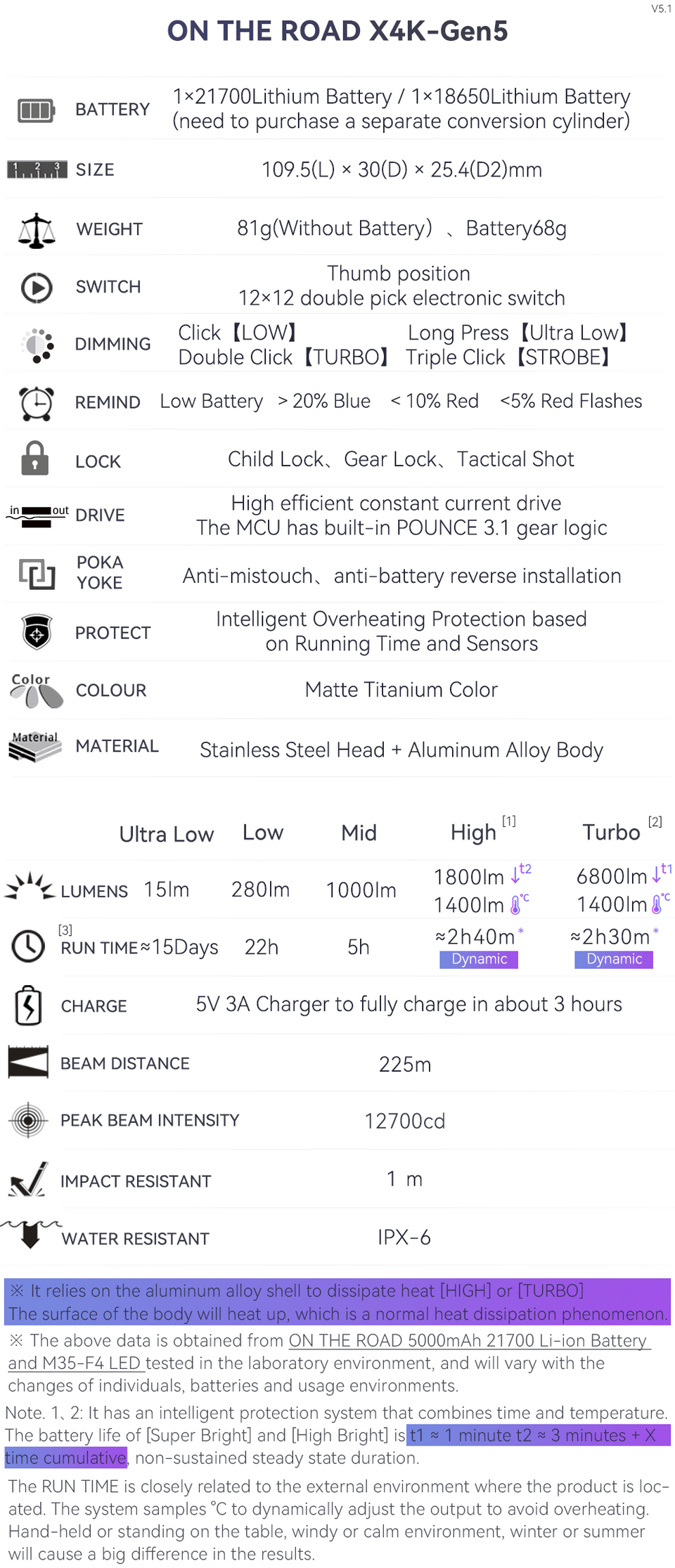 Seeing that this is a 5-emitter light which is quite unique, taking the plunge, I chose the one with M35-F4 chips at 6500k, with a claimed output of 6800(!) lumens on turbo, **and** paired with a constant current driver on top. If you’re curious about other specs, do check out the included spec sheet.