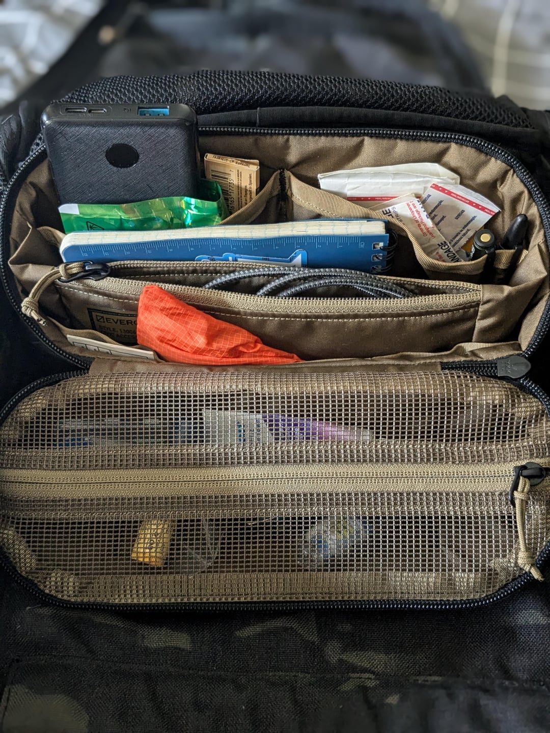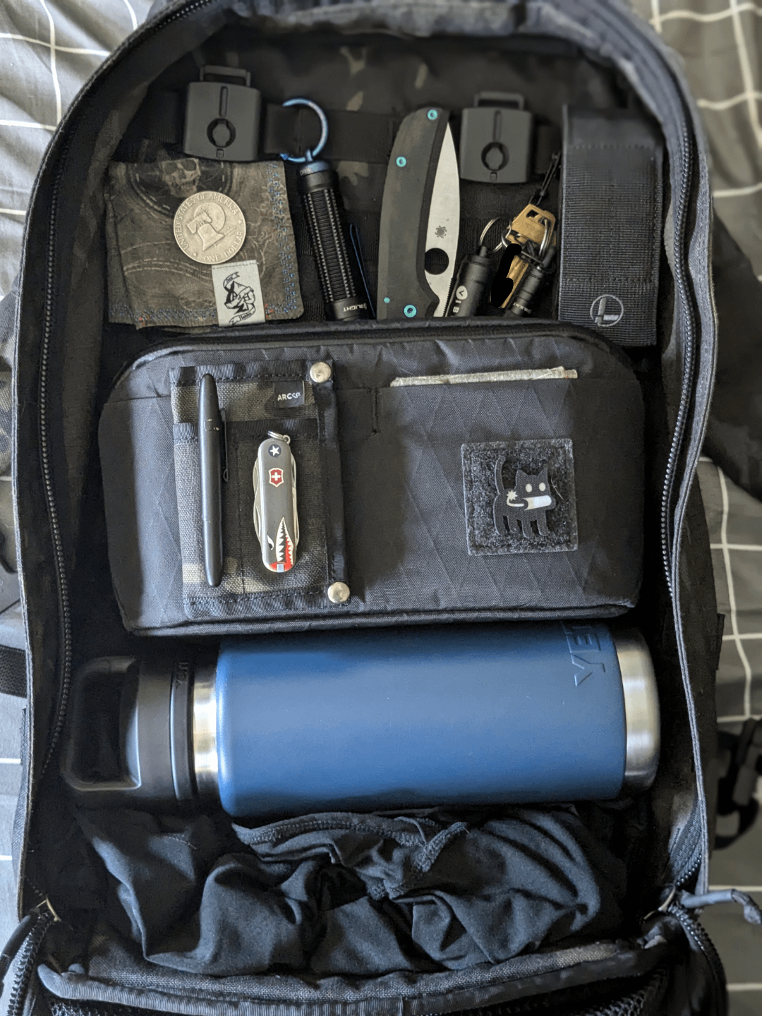 Arc co boulder wallet has an sak rambler and a space pen and stays in the front pocket of the evergoods CAP2.