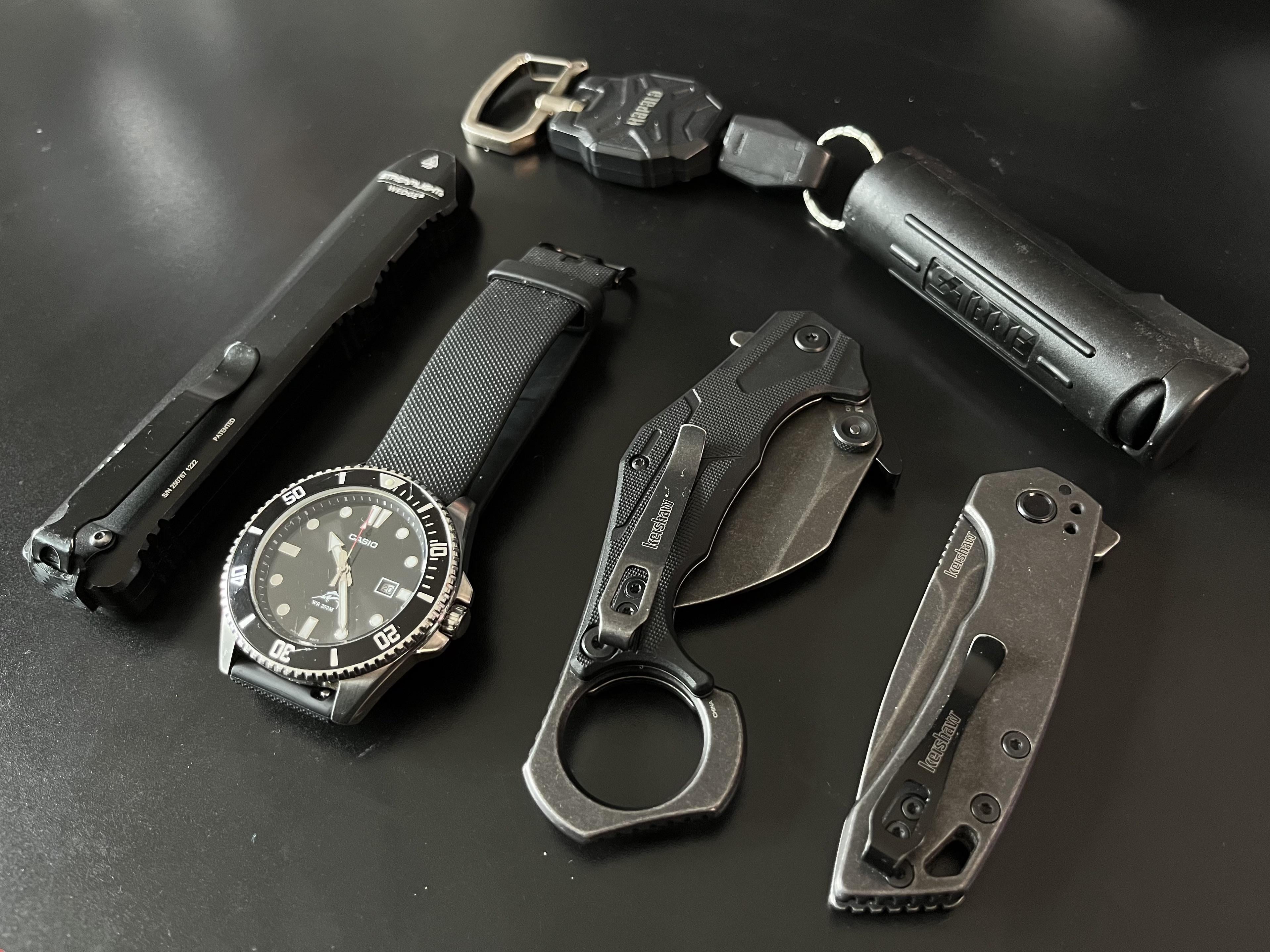Streamlight Wedge, Casio Duro, Kershaw Outlier w/ SnaggleTooth mod, Kershaw Radar, Sabre OC gel on a Rapala retractable lanyard