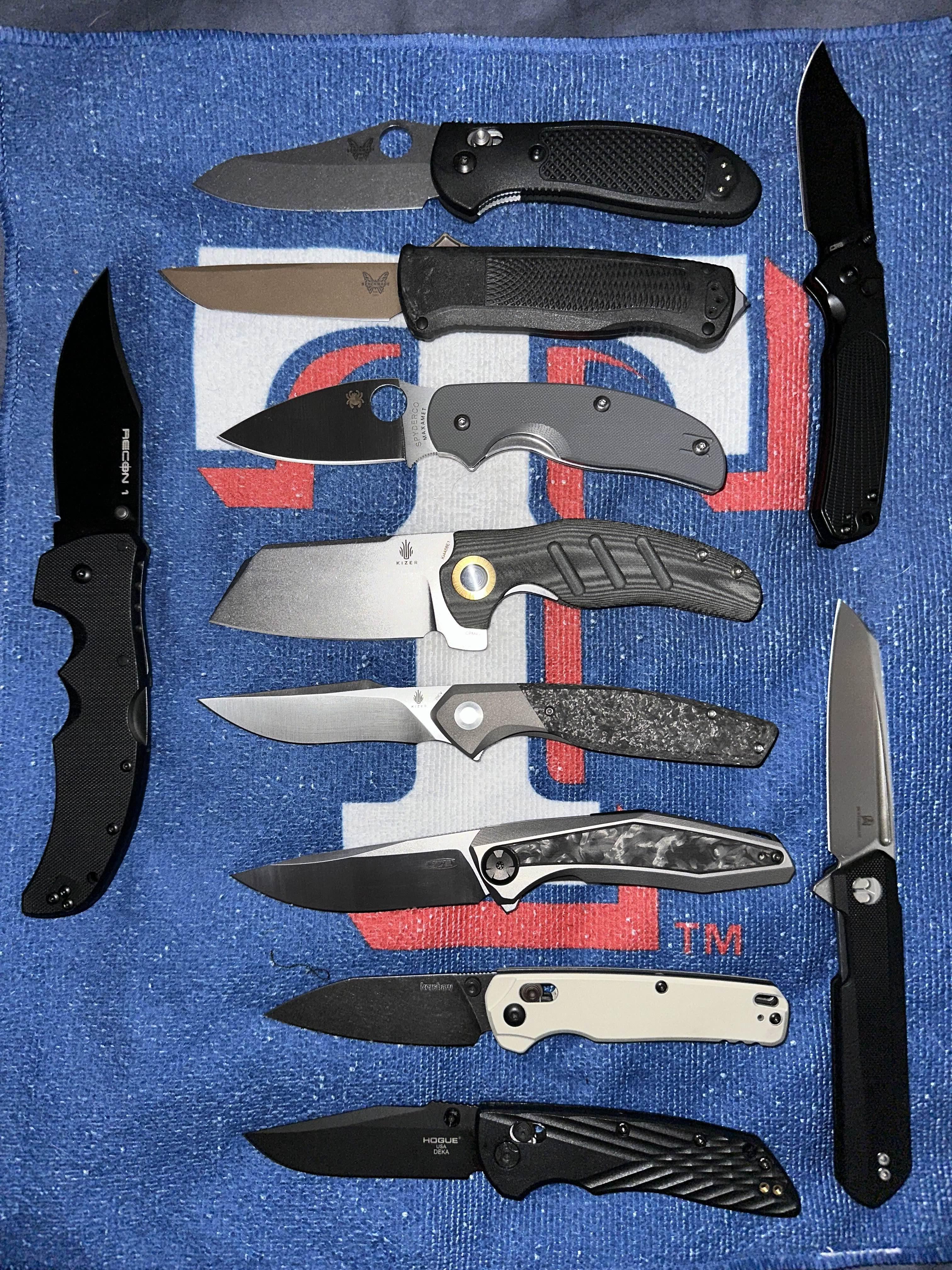 Knives are as listed: (left, right, top to bottom) Cold Steel Recon 1 – S35VN Black DLC , CJRB Pyrite Black Steel S90V , Bestech Ostap Hel Dundee Magnacut , Benchmade Griptillian (Full Size) S30V , Benchmade Shootout Cru-Wear , Spyderco Sage 1 Maxamet , Kizer Sheepdog 4V Stonewashed , Kizer Sherif Manganas Grazioso 20CV Satin , Zero Tolerance Sinkevich 0470 20CV (w/ Marbeled Carbon Fiber inlay, Titanium Frame), Kershaw Bel-Air Magnacut Stonewashed, and Hogue Deka Magnacut Black DLC