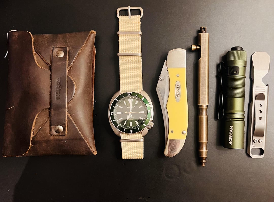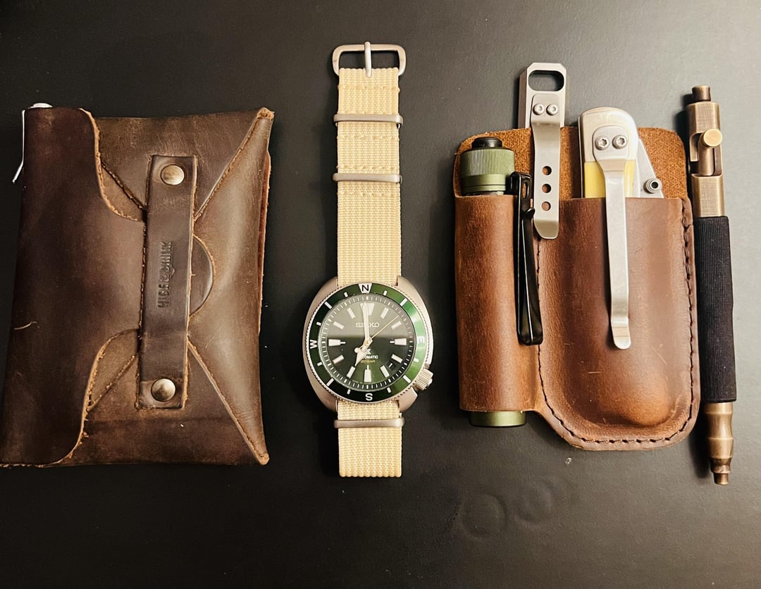 My Fall carry. Hide and Drink leather wallet- Seiko Land Tortoise 🐢 on beige nato- leather pocket organizer with Acebeam AAA- Case Trapperlock Kickstart- Smootherpro brass bolt action and generic Ti prybar