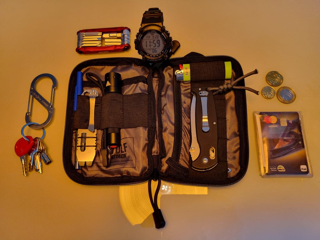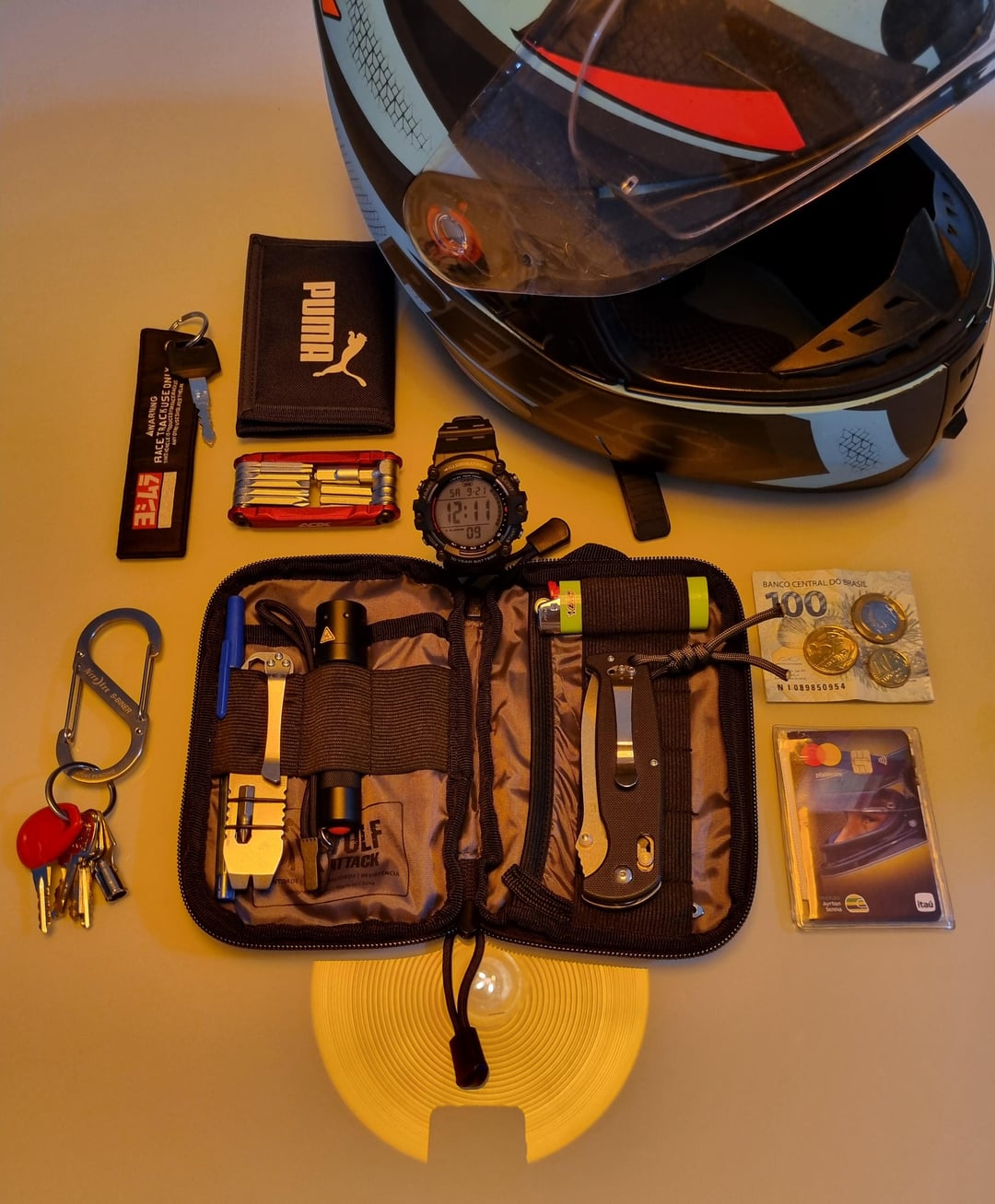 1° Organizer Wolf Essential Black – 2° Cásio AE-1500wh Watch – 3° Ganzo G7412 Pocket Knife – 4° Solidline Ledlenser SL-Pro 110 Flashlight – 5° Nite Izi S-biner #4 Stainless Steel Carabiner – 6° CIMO Arch #1 PryBar Multitool 10 in 1 – 7° Adx Repair Tools Red 13 Functions – 8° Puma Phase Navy Wallet – 9° Bic Green Portable Burner – 10° Motorcycle key and helmet – 11° Brazilian Coins 🇧🇷