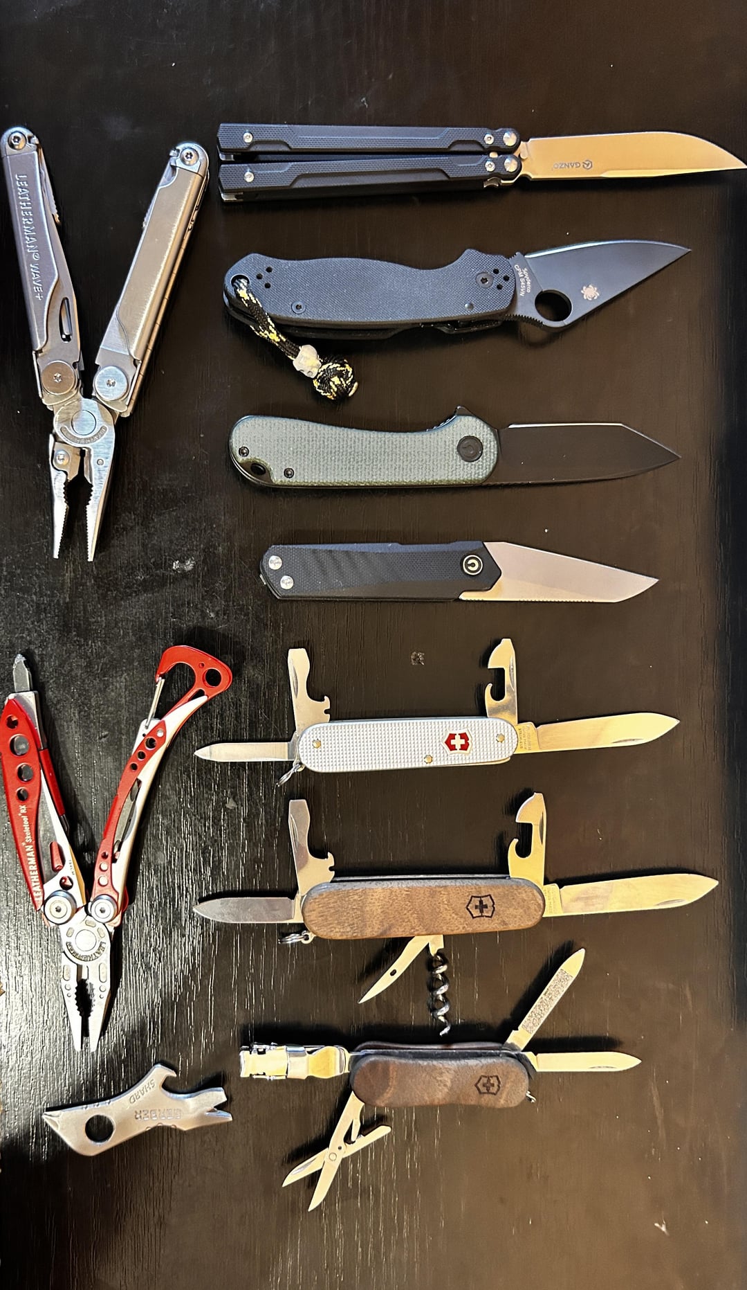 1-ganzo balisong G766 440c 2-spyderco para 3 s45vn 3-civivi elementum tanto D2 4-civivi ki-v plus Nitro-v 5-leatherman wave plus 6-Gerber shard 7-victorinox cadet 8-victorinox spartan wood 9-victorinox wood 580 10-leatherman skeletool RX