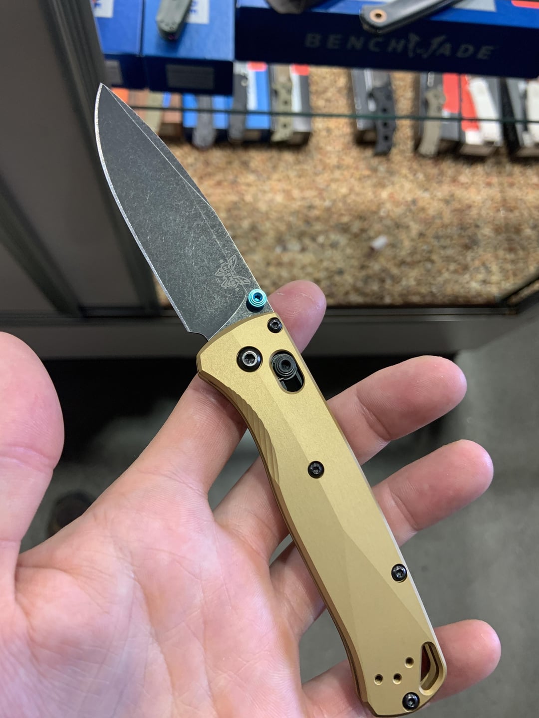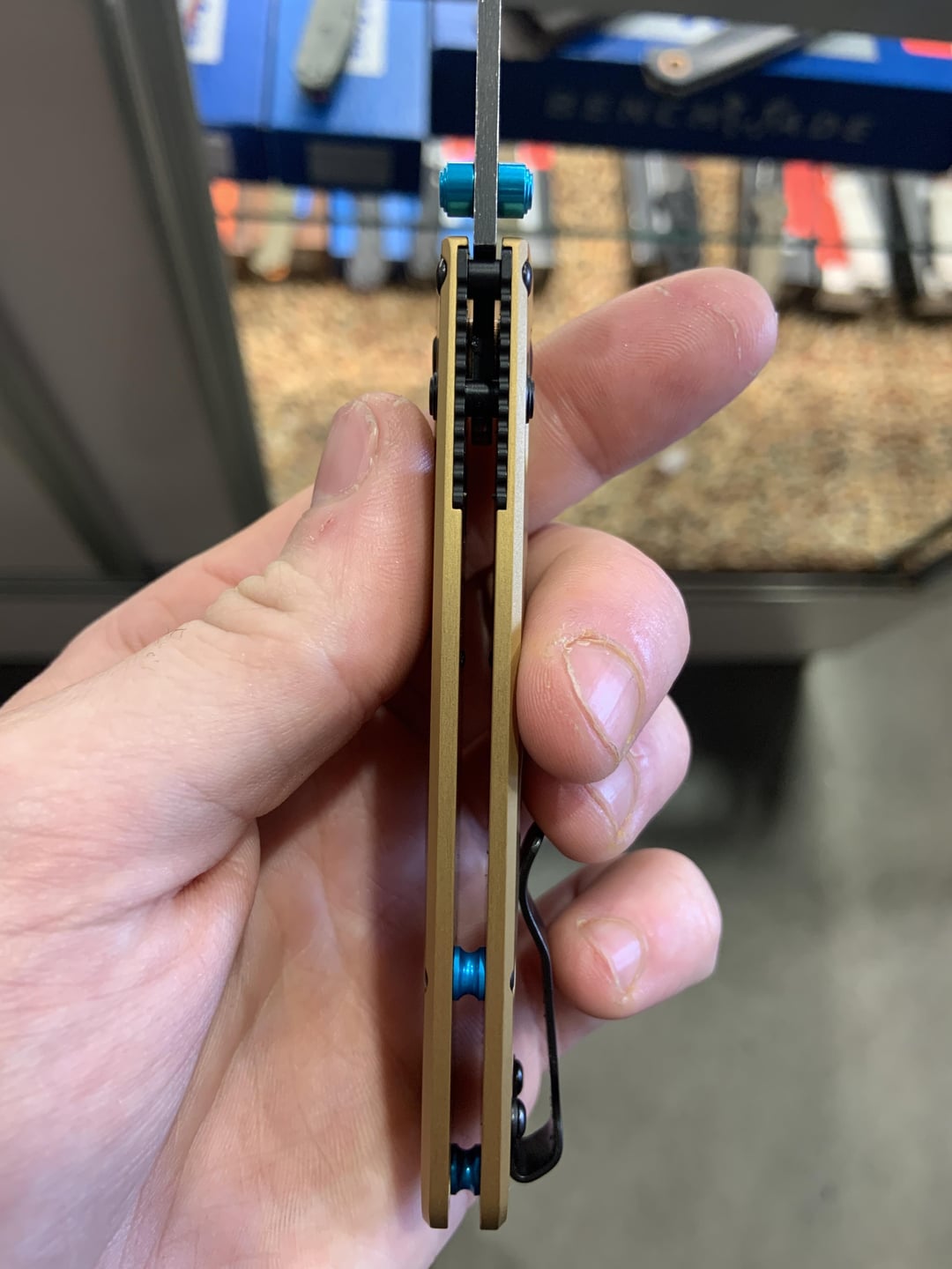 Personally I love it. Little heavier in the hand, it’s got that nice stone wash blade color and I love the contrast between the gold & cyan.