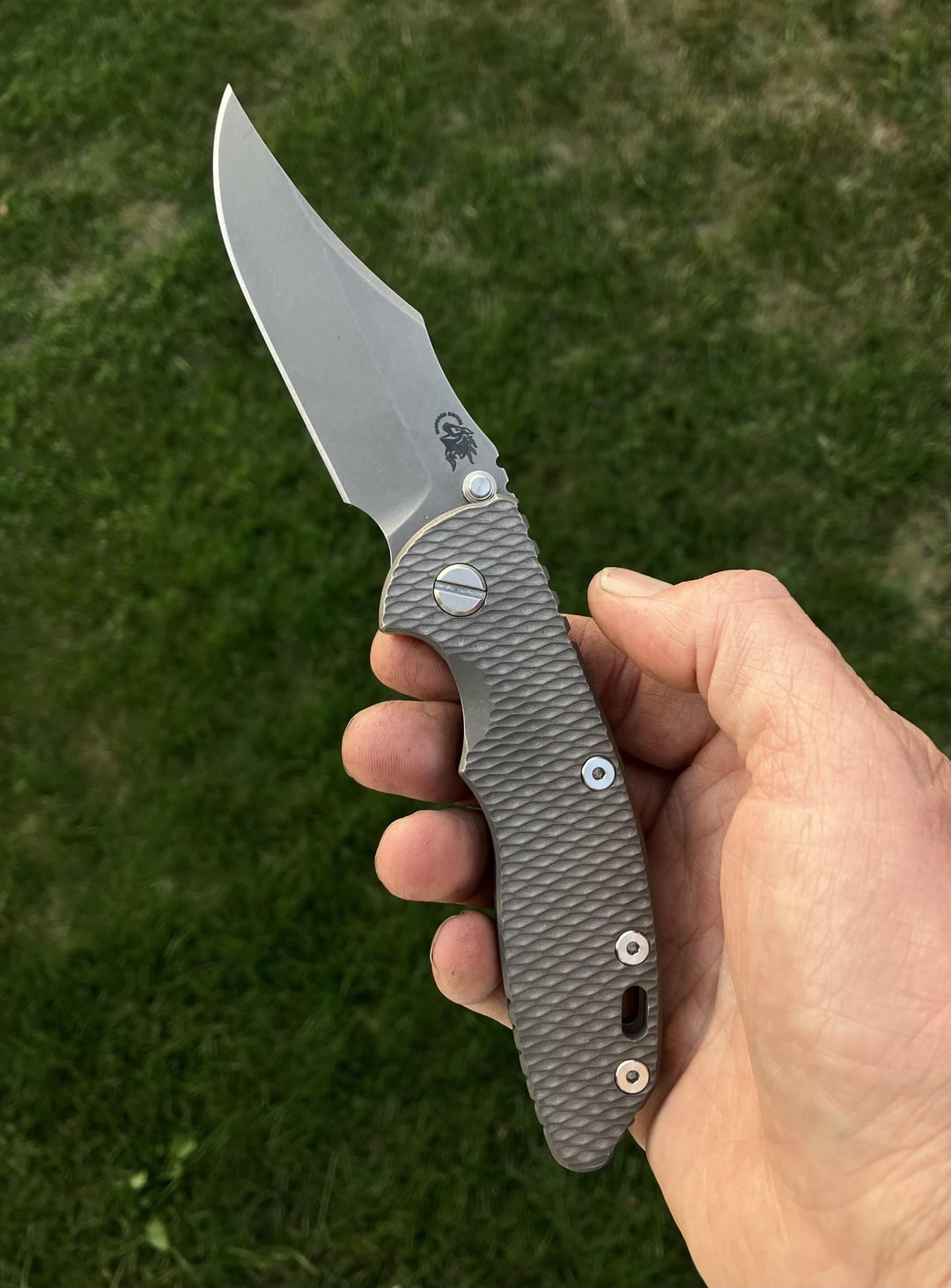 Got some factory working finish Ti scales to go with my new Bowie. Sure is purdy, Clark. After and before pics…