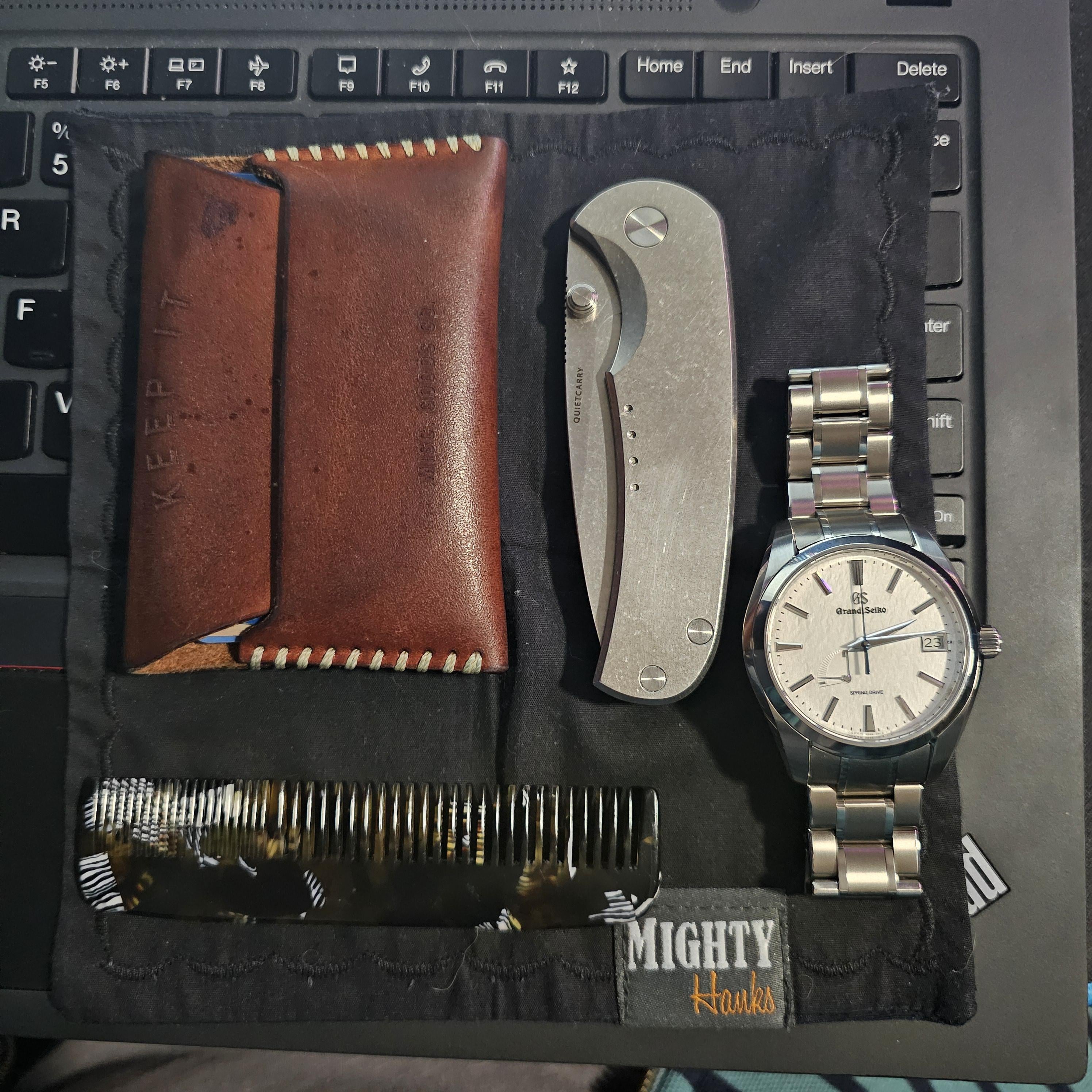Misc goods Co wallet, quiet carry drift, grand seiko snowflake, beardbrand comb, Might Hanks handkerchief