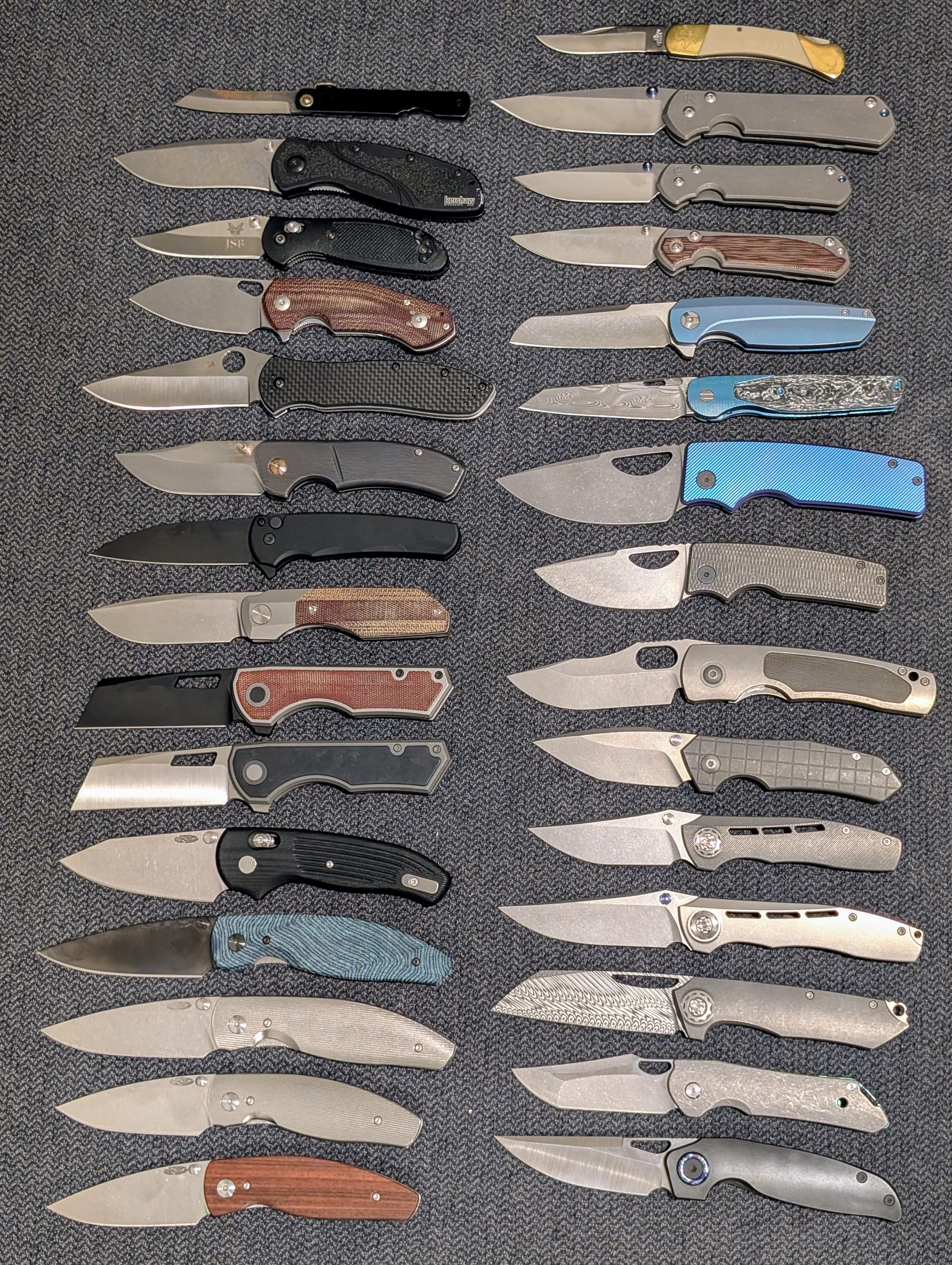 From top left to bottom right: Higonokami, Kershaw Blur, Benchmade Mini Griptilian, GiantMouse Biblio, Spyderco Gayle Bradley 2, Boker Jive (Customized), ProTech Malibu, Vero Synapse, Brain Brown Yeager M V2, Brian Brown Yeager M V2, TRM Shadow, TRM Atom DLC, TRM Atom, TRM Neutron 2, TRM Neutron, Col. Littleton, Sebenza 31 Large, Sebenza 31 Small, Sebenza 31 Small Natural Micarta inlay, Holt Haptic, Brown Knives Cortex, Oz Roosevelt XL, Oz Roosevelt, Stang Bladeworks Pyrenees V3, Efros MAC Doom, Eutsler Dukling, Eutsler DUK, Eutsler Neutralizer Damasteel, JK Designs Outpost, HMC Transient Subliner 3.2.