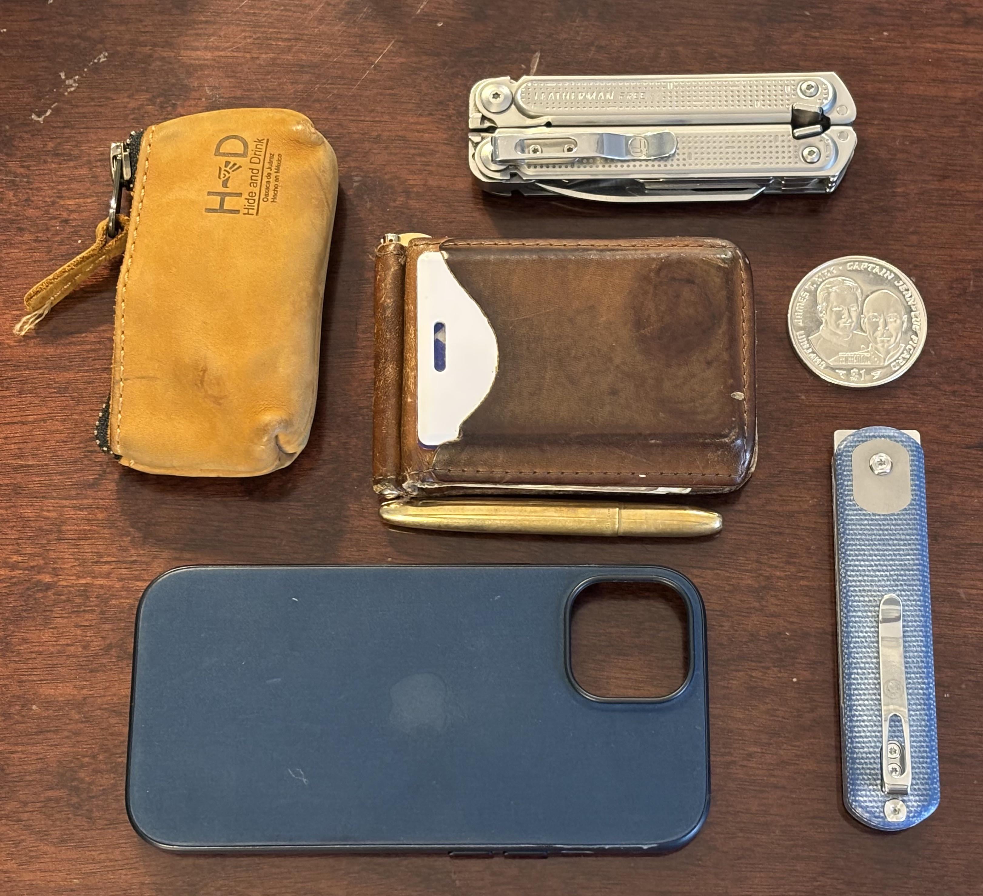 Dadjokes-beware 1 year ago – Hide and Drink Key Pouch – iPhone – No-brand thin Wallet – Vosteed Sheepsfoot Corgi – Leatherman P2 – Liberian Star Trek Captains Dollar Coin – Copper Space Pen