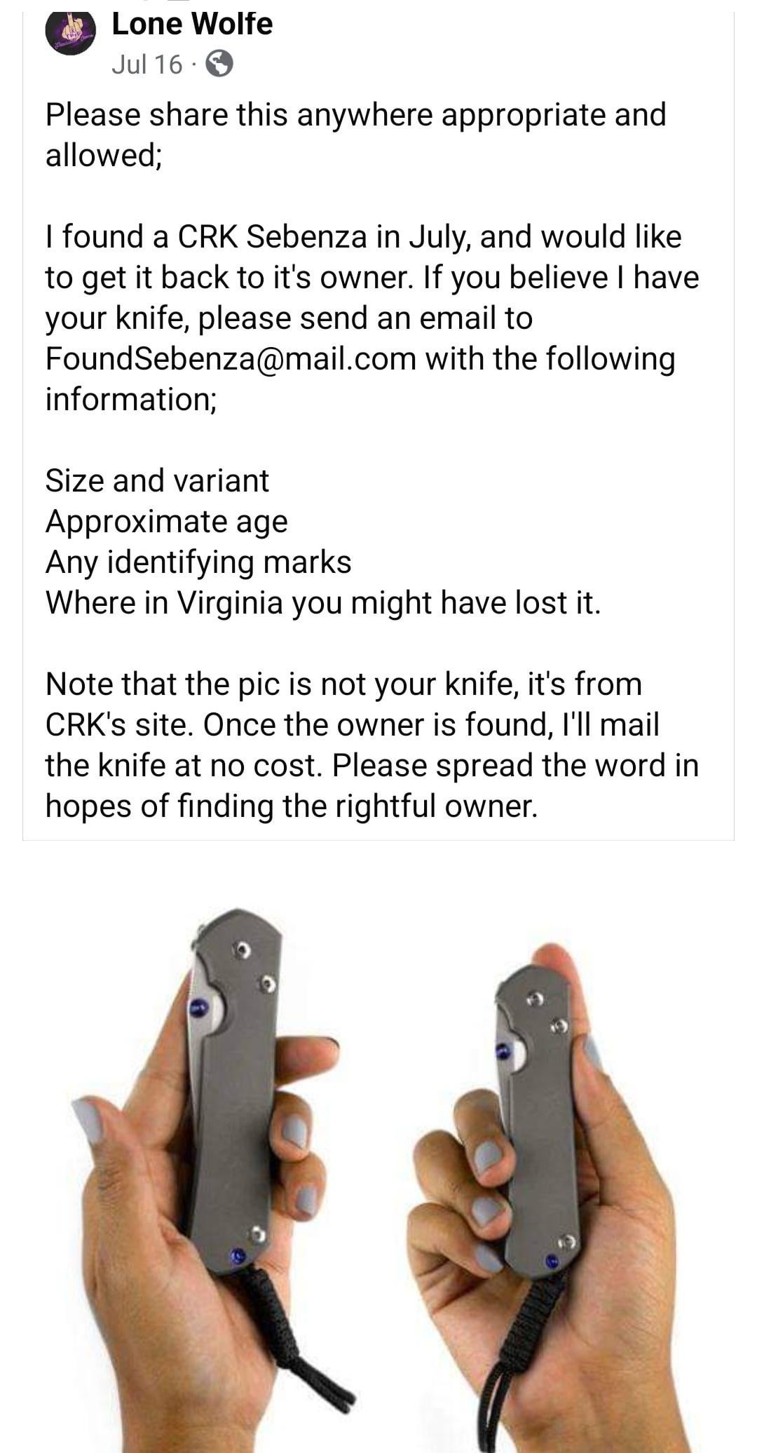 In KNIVES From CRK Facebook Group, in case anyone lost a Sebenza in Virginia September 26, 2024 From CRK Facebook Group, in case anyone lost a Sebenza in Virginia by deathbysupercool KnifeKnives Prev Post Rate my edc September 26, 2024 Next Post Help me ID this knife? September 26, 2024 Related Posts Immaculate January 17, 2026 Bringing the 🔥 with the Tenableknives team January 17, 2026 Slipjoint Saturday January 17, 2026Write A CommentYou must be logged in to post a comment.