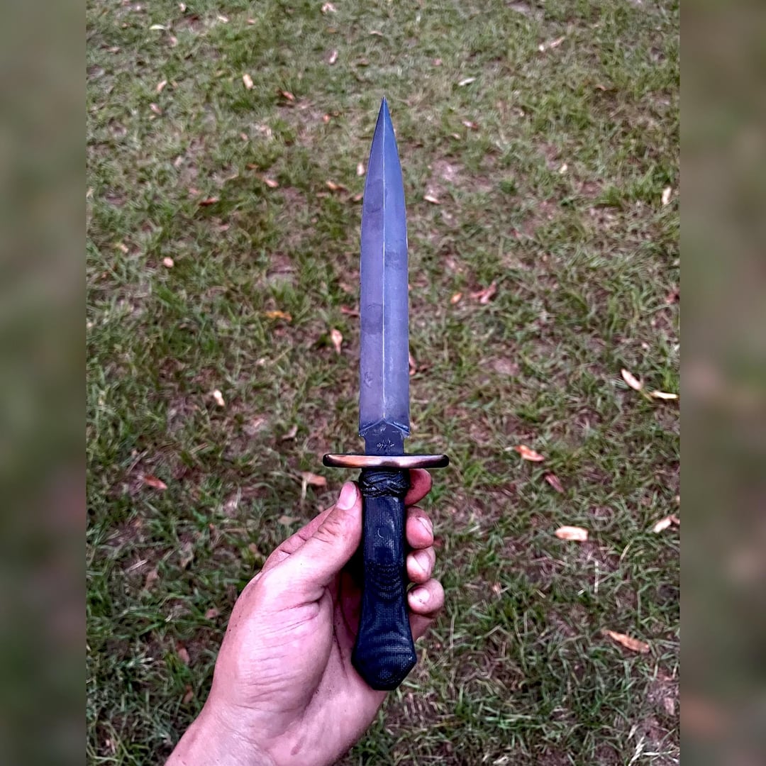 Changed up a few things on this one based off of y’all’s critiques from #1 and I think it turned out great. Added a Turks Head Knot to the top of the handle to add a little bit more character, shortened the guard as well as added a dimpled texture to the top of it. The blade was hollow ground with a 3” wheel and has a convexed tip for added strength.