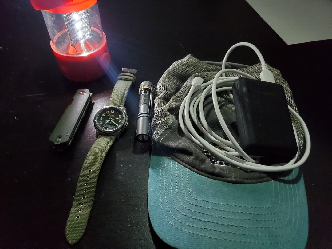 No power due to a storm. Plenty of cheap dollar store lanters and light, my entire collection of SAK at my disposal. So this is my walking around gear until it there’s light again!