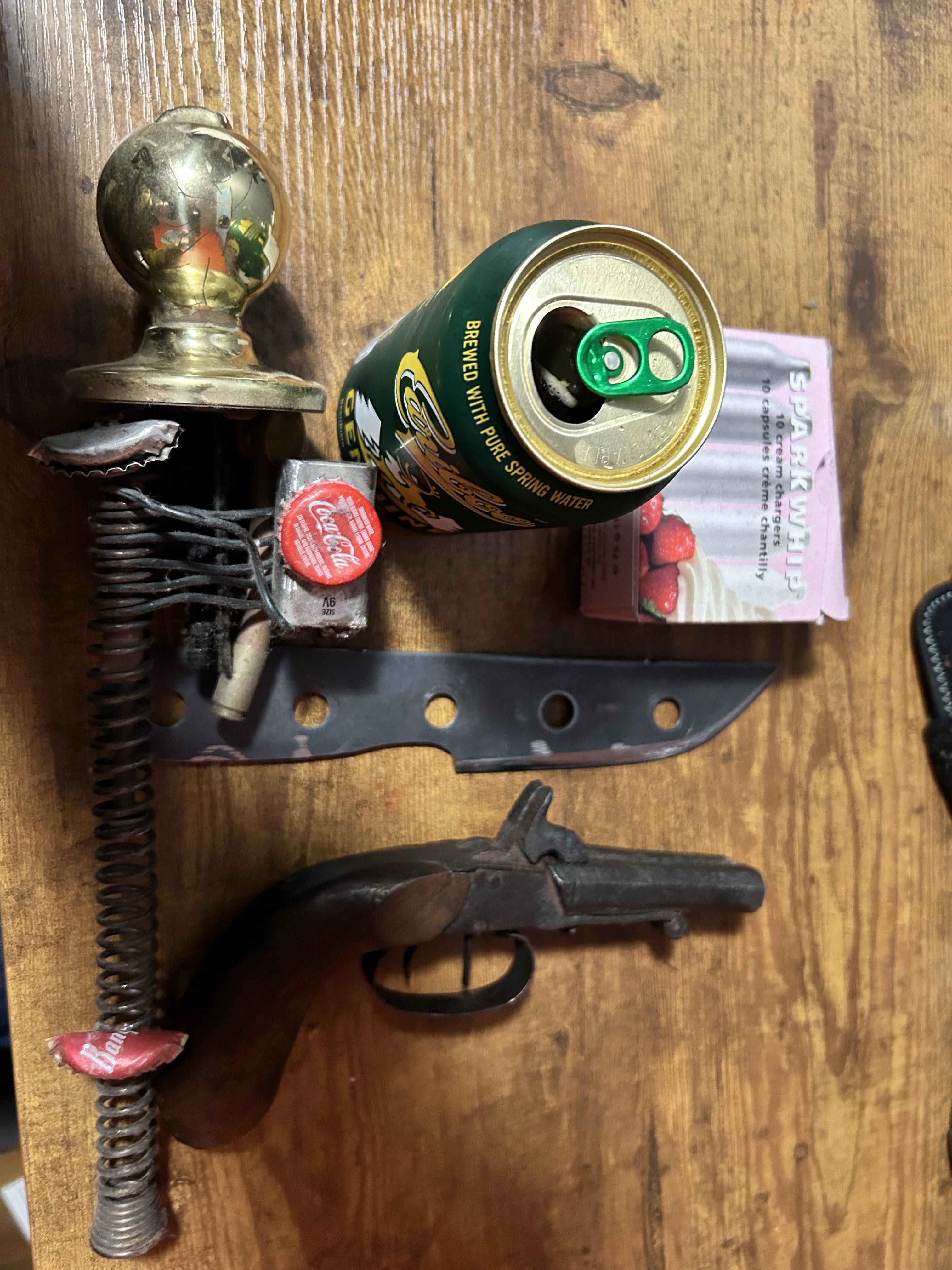 Old vintage flintlock? Lawn mower knife, carbioo beer, door handle spring contraption, spark whip