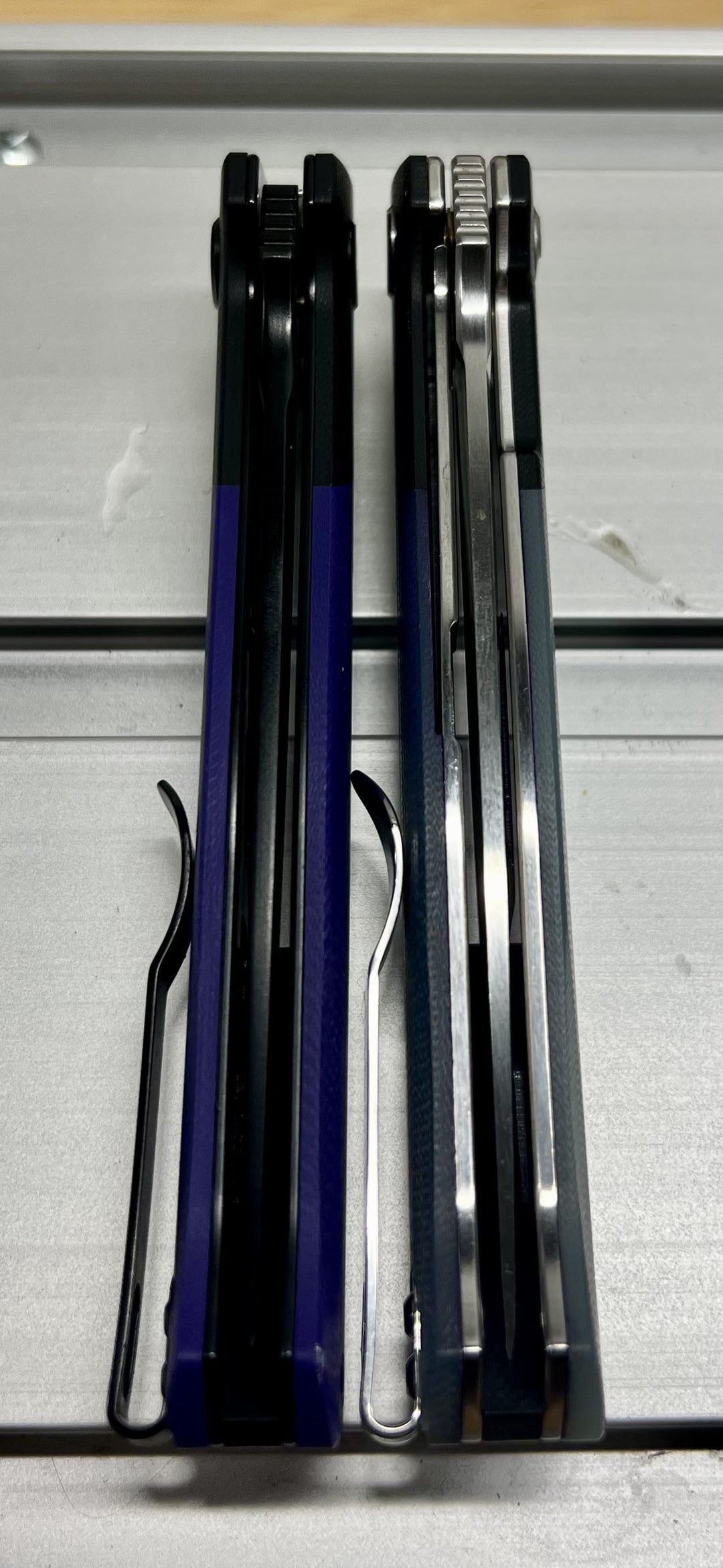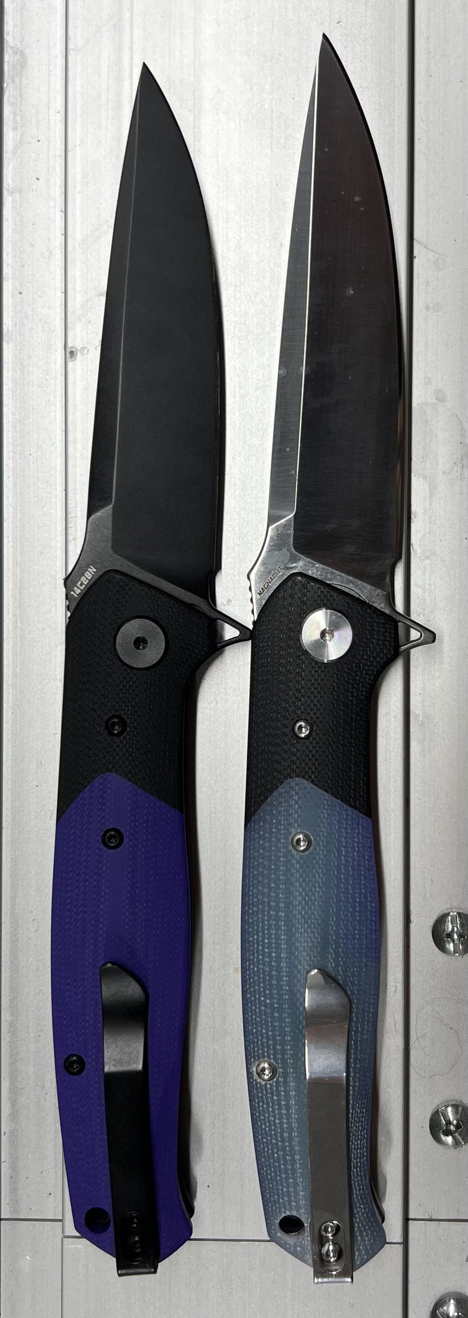 This post is the outcome of another feed conversation concerning a comparison of the Bestech Swordfish liner-lock vs button-lock. Note: I had to reprofile the tip of the Magnacut blade, so it’s a good 1/32” to 1/16” shorter than factory intended. Looking at the side profile, you can see the liner-lock version liners are over twice as thick as the button lock. The handle is a touch longer comparing the centerline of the pivots and the Magnacut blade has one more jimp. Enjoy.