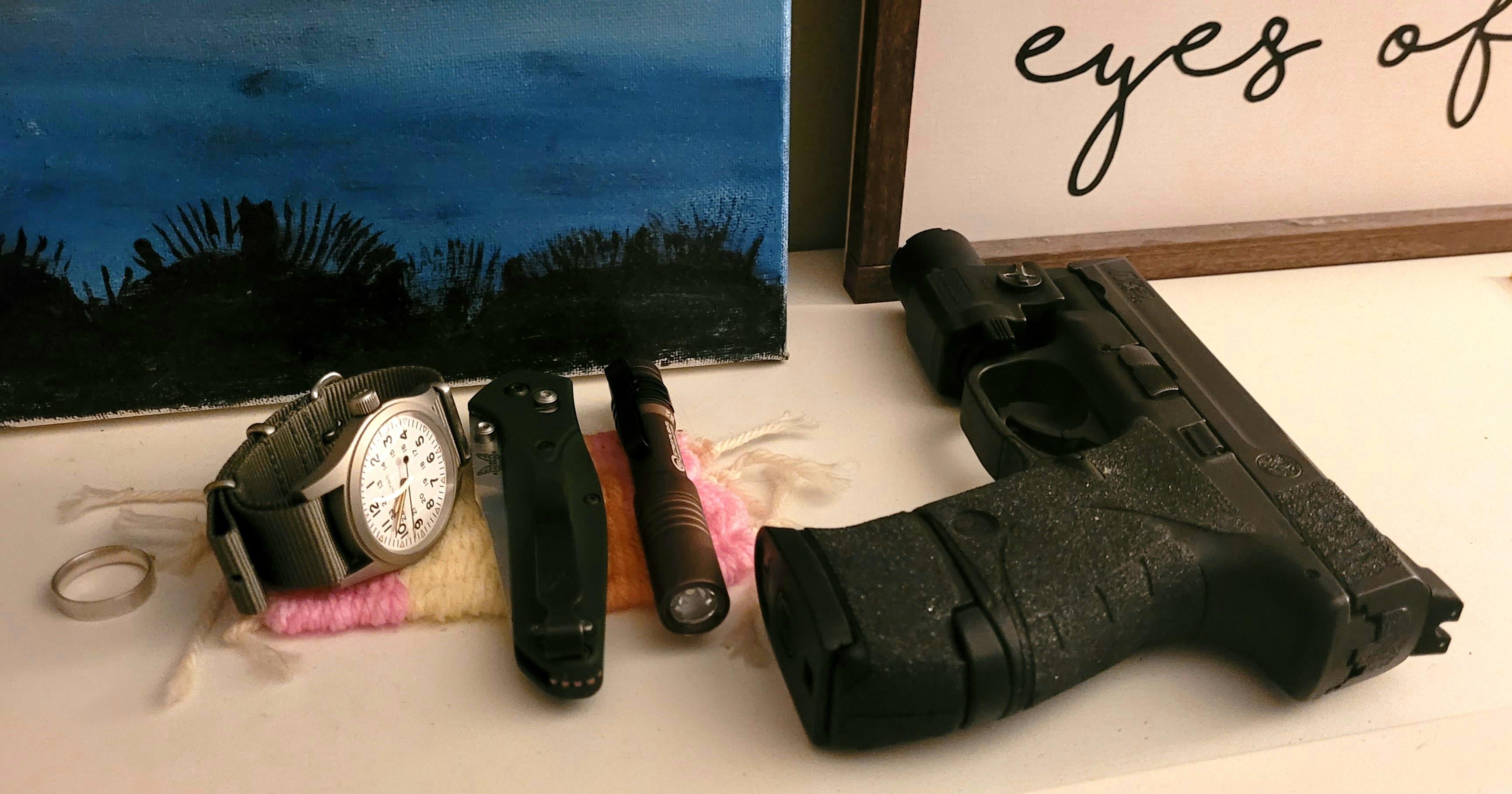 Hamilton khaki field mechanical, benchmade 940, microstream, m&p 9c with trl1 and xgrip.