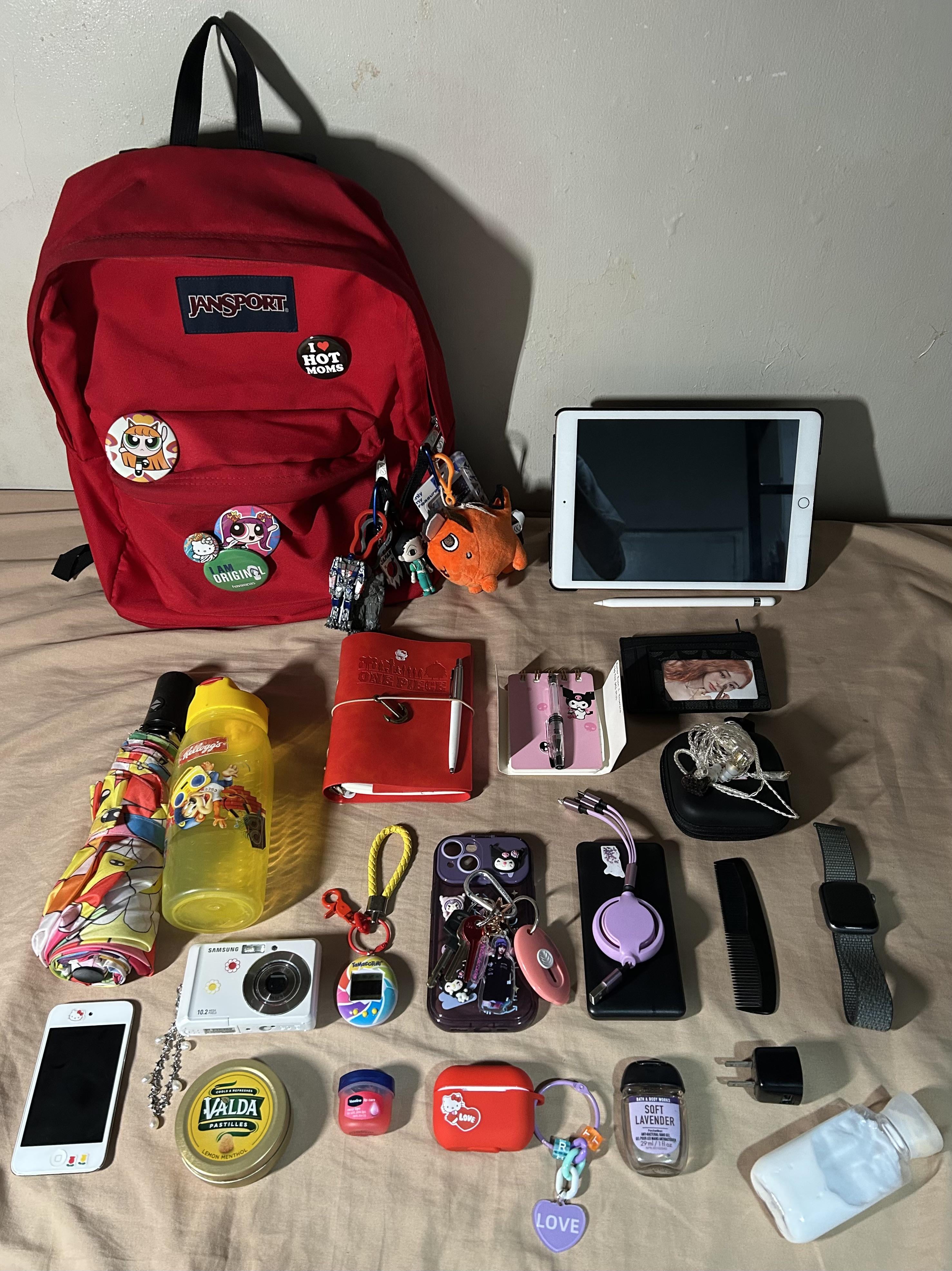iPhone 14, iPad (7th gen), umbrella, water bottle, iPod Touch (4th gen), Samsung SL30, Tamagotchi P1, AirPods Pro (1st gen), Apple Watch Series 4, TOPK battery pack, 3-in-1 retractable charging cable (no brand), BlackBerry charging brick, Coach wallet, moisturizer, lip balm, hand sanitizer, the IEMs are the TANGZU Wan’er S.Gs with some earplug tips, and the pens are the Parker Jotter and Dong-A Fine Tech Mini!