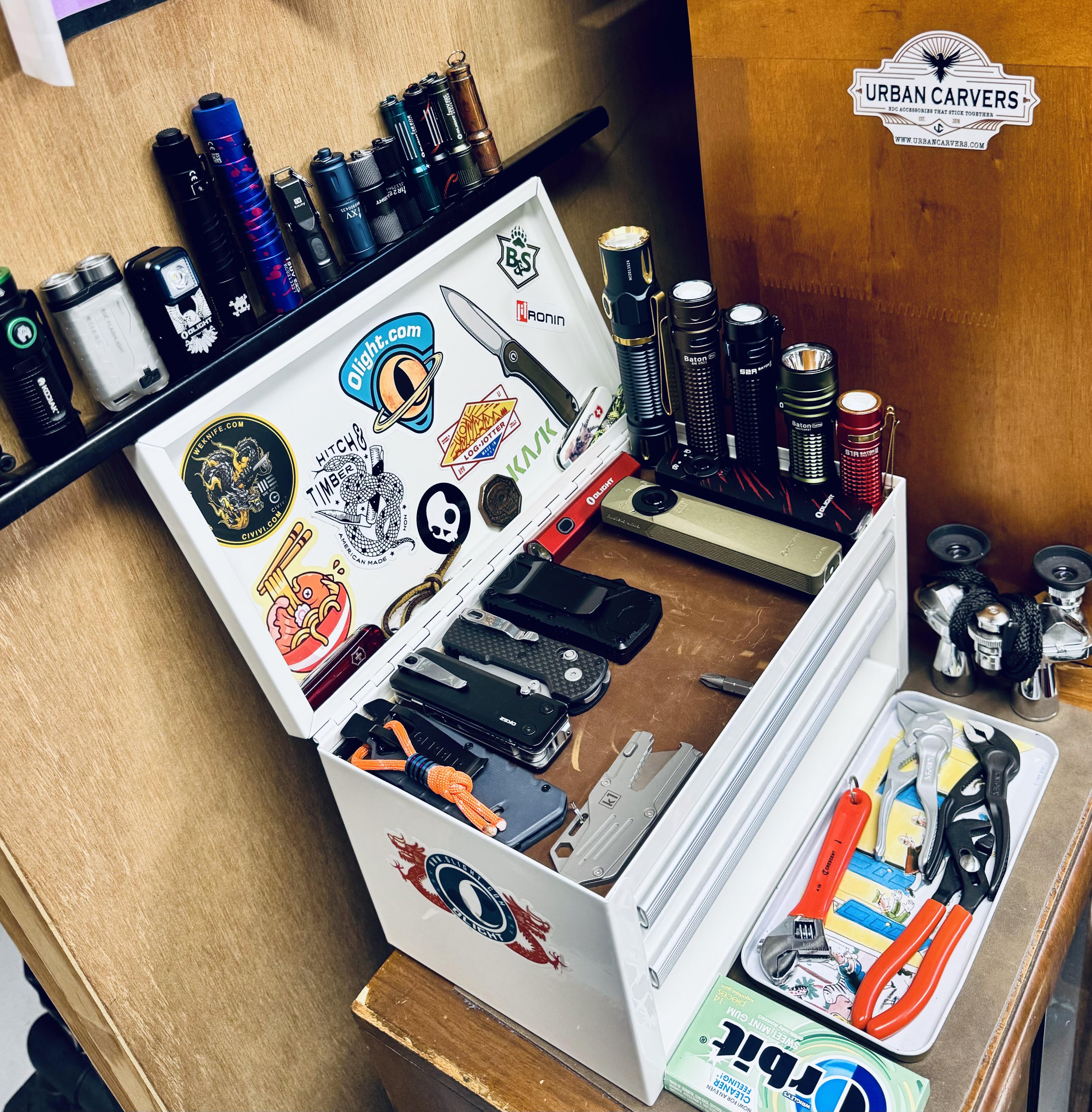 Various Olight flashlights and knives, Gerbeer, Knipex, Crescent, Victorinox and some others.