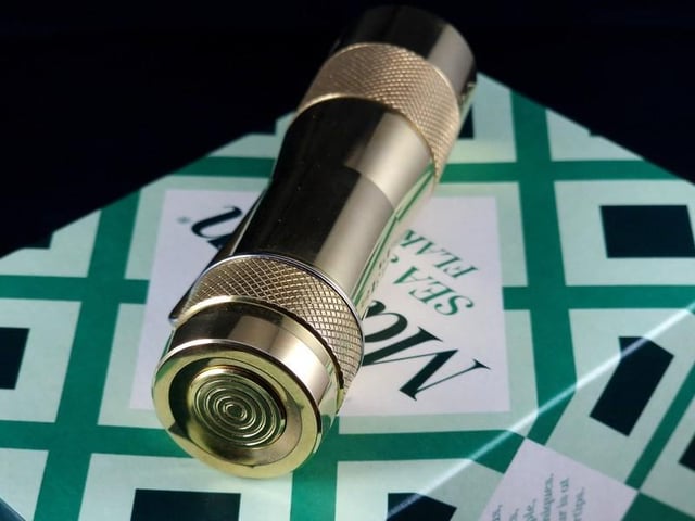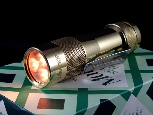 This is a brass FW3A modded with 1800K FFL351A emitters and 3 channels of orange aux LEDs to give a glowing ember effect in disco mode (idea from [a post on here](https://www.reddit.com/r/flashlight/comments/13oxll9/i_hear_some_of_you_like_orange_aux_how_many_can/)).