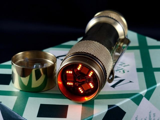 dognodding 1 year ago This is a brass FW3A modded with 1800K FFL351A emitters and 3 channels of orange aux LEDs to give a glowing ember effect in disco mode (idea from [a post on here](https://www.reddit.com/r/flashlight/comments/13oxll9/i_hear_some_of_you_like_orange_aux_how_many_can/)).The FET+7+1 driver was upgraded with an ATTiny1616 to support three separate aux channels.