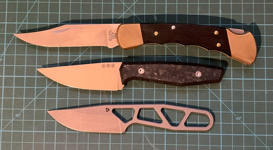 OK, so here’s a picture of my new AK1 / droppoint / carbon fibre. And of my AK2 that I got a week ago. Buck 110 for size comparison.