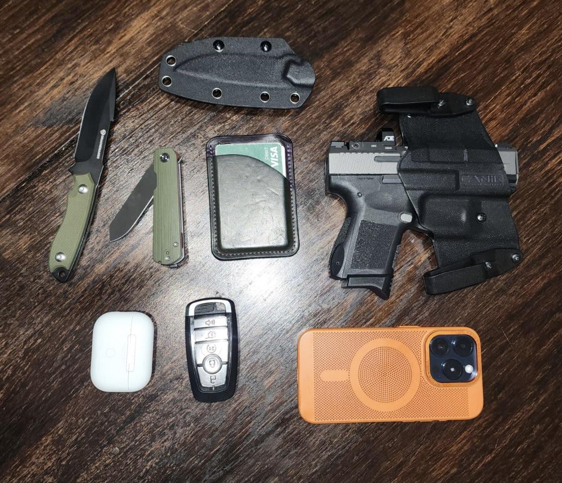 Drachenader 7” fixed, Civivi Sendy, snack money holder (Rambling Leather Co out of Oregon), Canik MC9 with ADE NUWA micro dot, AirPods, key fob, iPhone 15pro