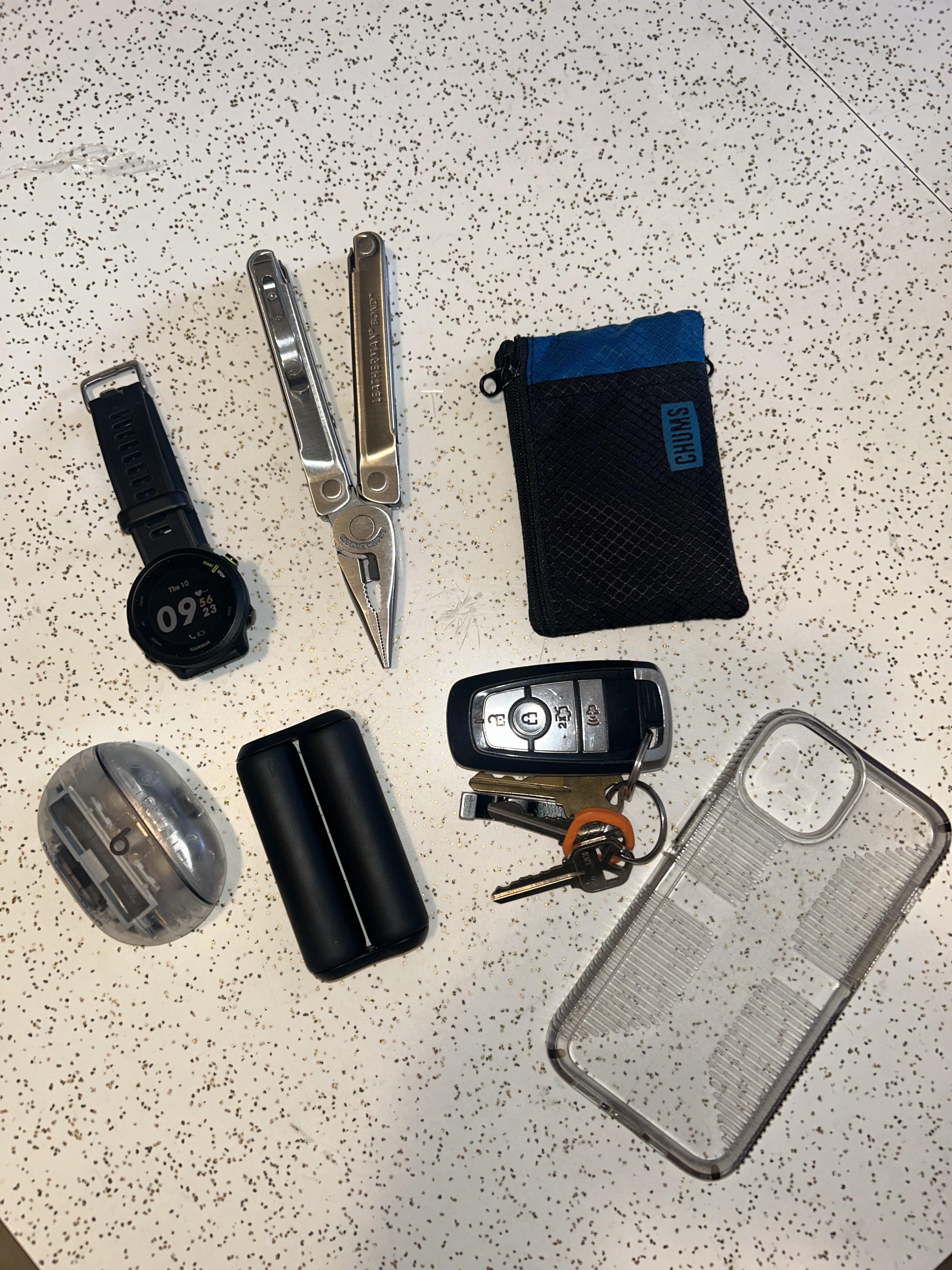 Leatherman Bond, Garmin forerunner 55, iPhone 14, ONO fidget roller, Beats Studio pods, Chums Surfshort wallet, and car keys. I like to keep it fairly simple newest addition is the fidget roller. I don’t love my wallet, if anyone has any recs for something thin and low pro that would be awesome. Love the sub 🫡
