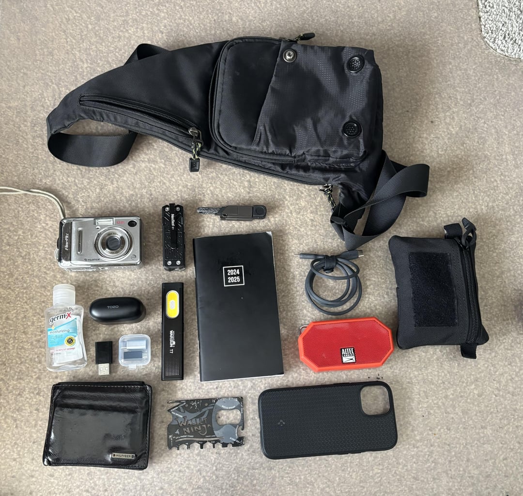Usually carry everything in this sling bag here except my phone (iPhone 15 w/ Spigen MagSafe Case), Wallet (Tommy Hilfiger Leather BiFold – Back Pocket Carry) and my keys (AliExpress Ridge Key dupe)