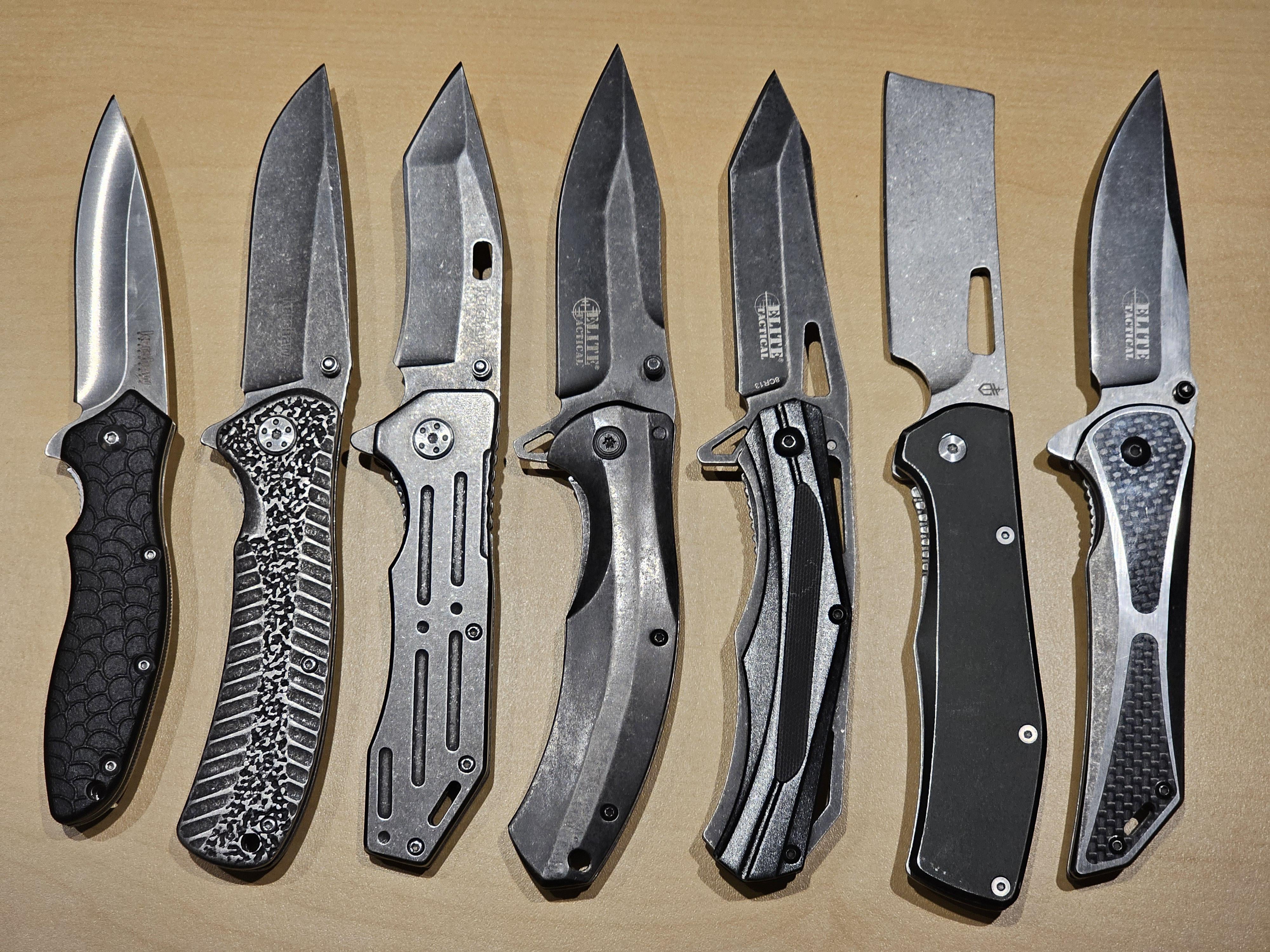 Elk ridge for fixed blades, Smith and Wesson for folders. Up to 5 customs for fixed blades and higher end to mid end folders