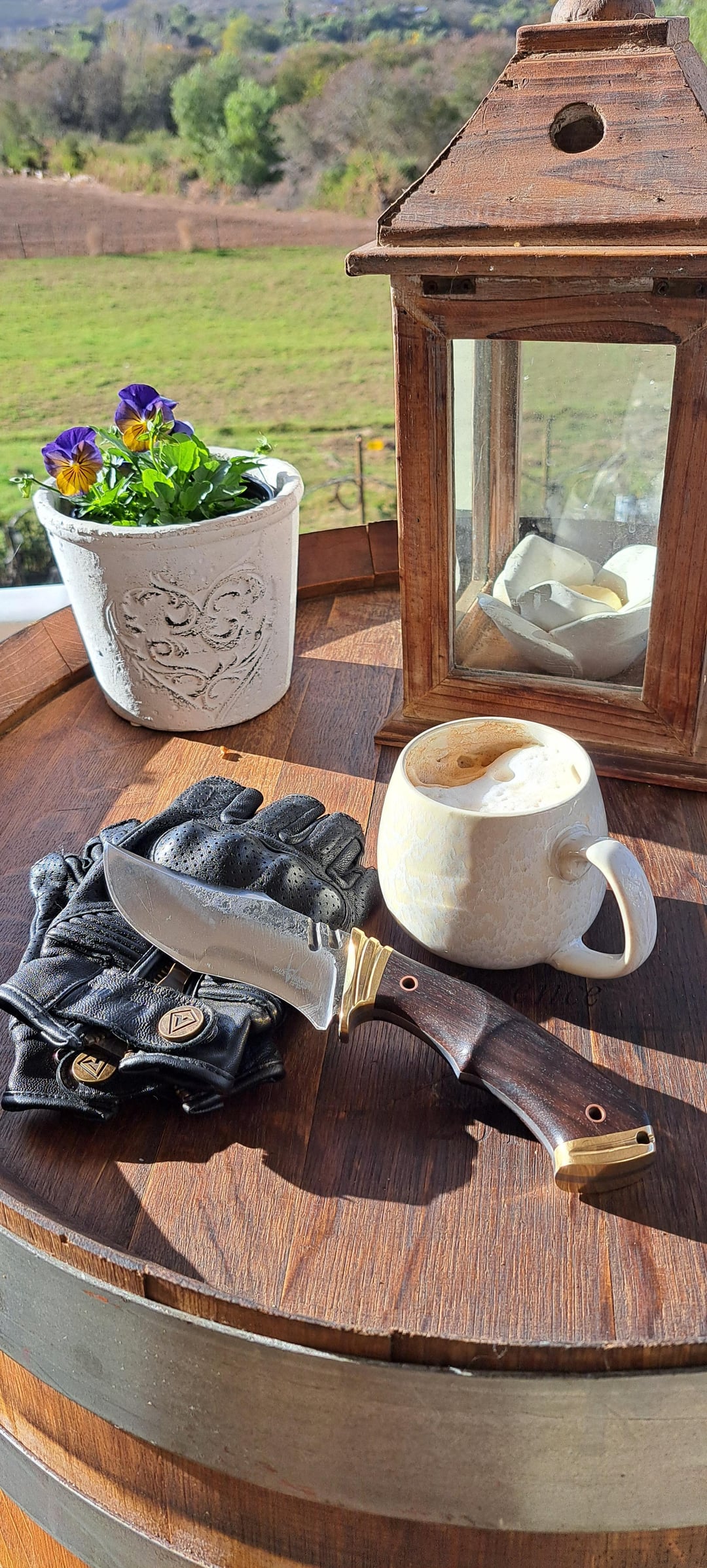 When I first received the blade it had a satin polish with brut de forge finish. After cutting through meat, vegetables, branches and a few other things, the satin finish decelops a patina. Sometumes I polish that off with a brass liquid polish and have now started seeing a hamon / quench line from the heat treat. Thats a little surprise I'd never have seen or enjoyed if I just left her in a drawer or display case.