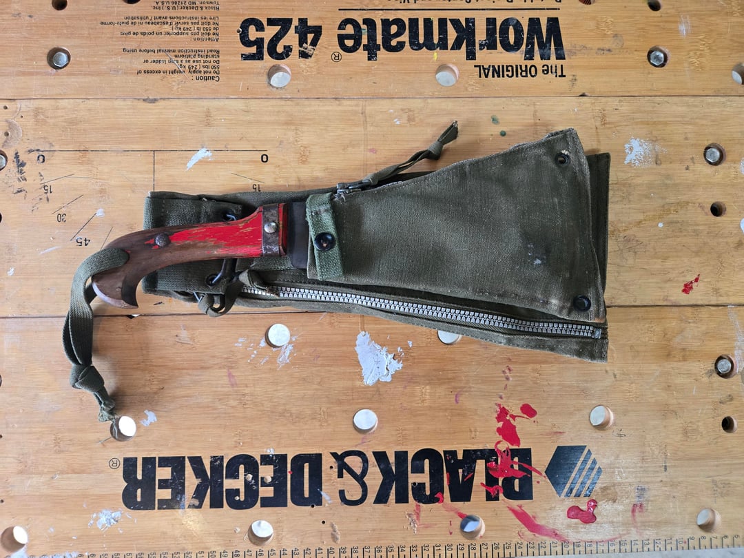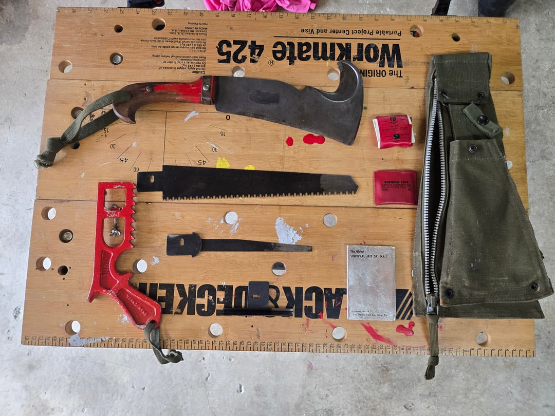 It has all the original items that came in the kit. Sharpening stone hasn't even been opened, as far as I can tell. The booklet is in great condition, the sawblades are sharp, even the burning class is unclouded and still very much usable. One hell of a find, if you ask me.