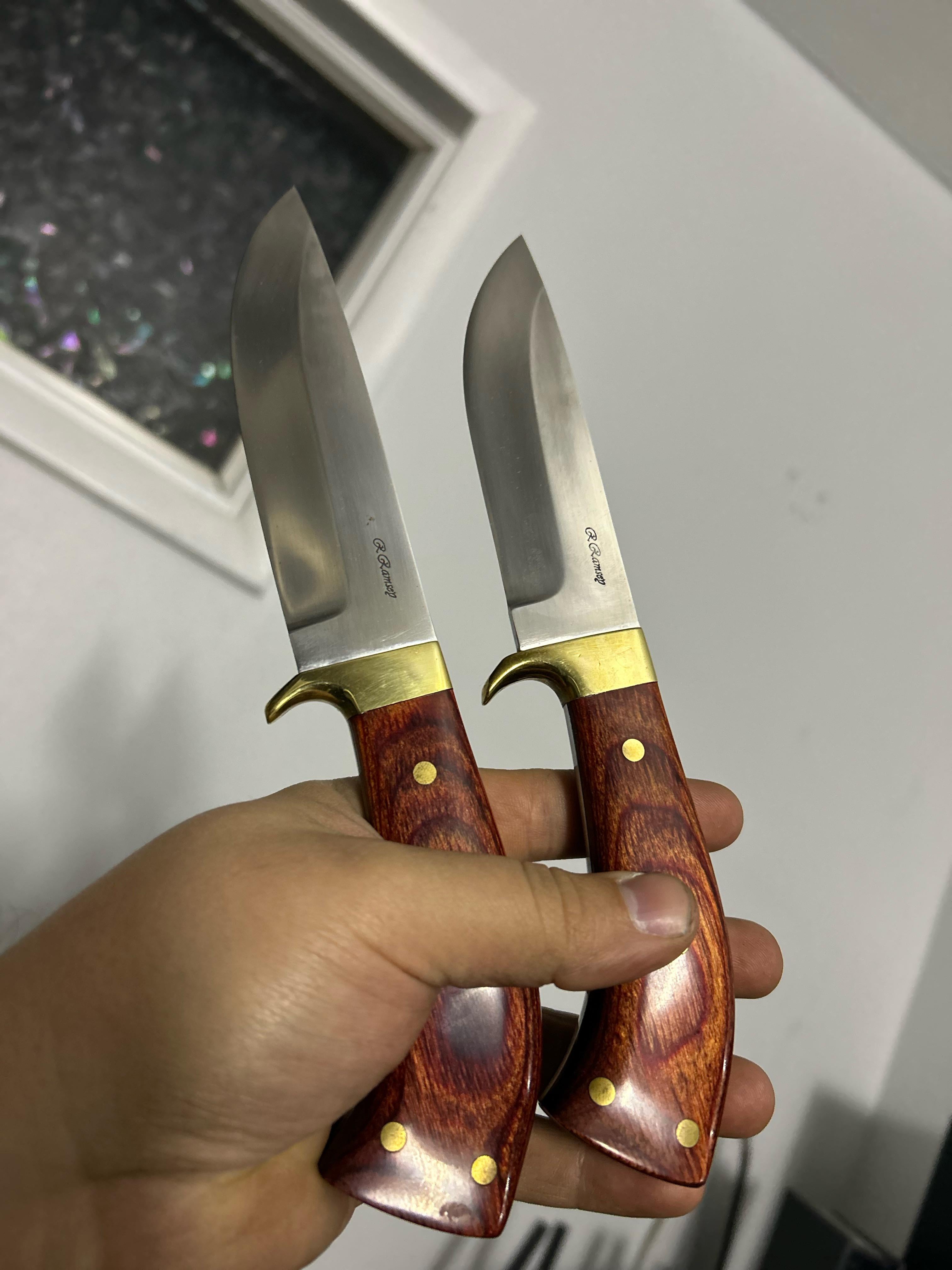 There was a custom maker who made knives like that. I think it was Ron Ramsey? Out of Missouri if I remember right. With two pins towards the butt and brass guards. I remember those having natural scales like horn, bone, etc not laminated wood like you have there. Checked out the ABS site and they don’t list anyone unfortunately. He was on bladeforums a decade ago if it’s who I think it is.