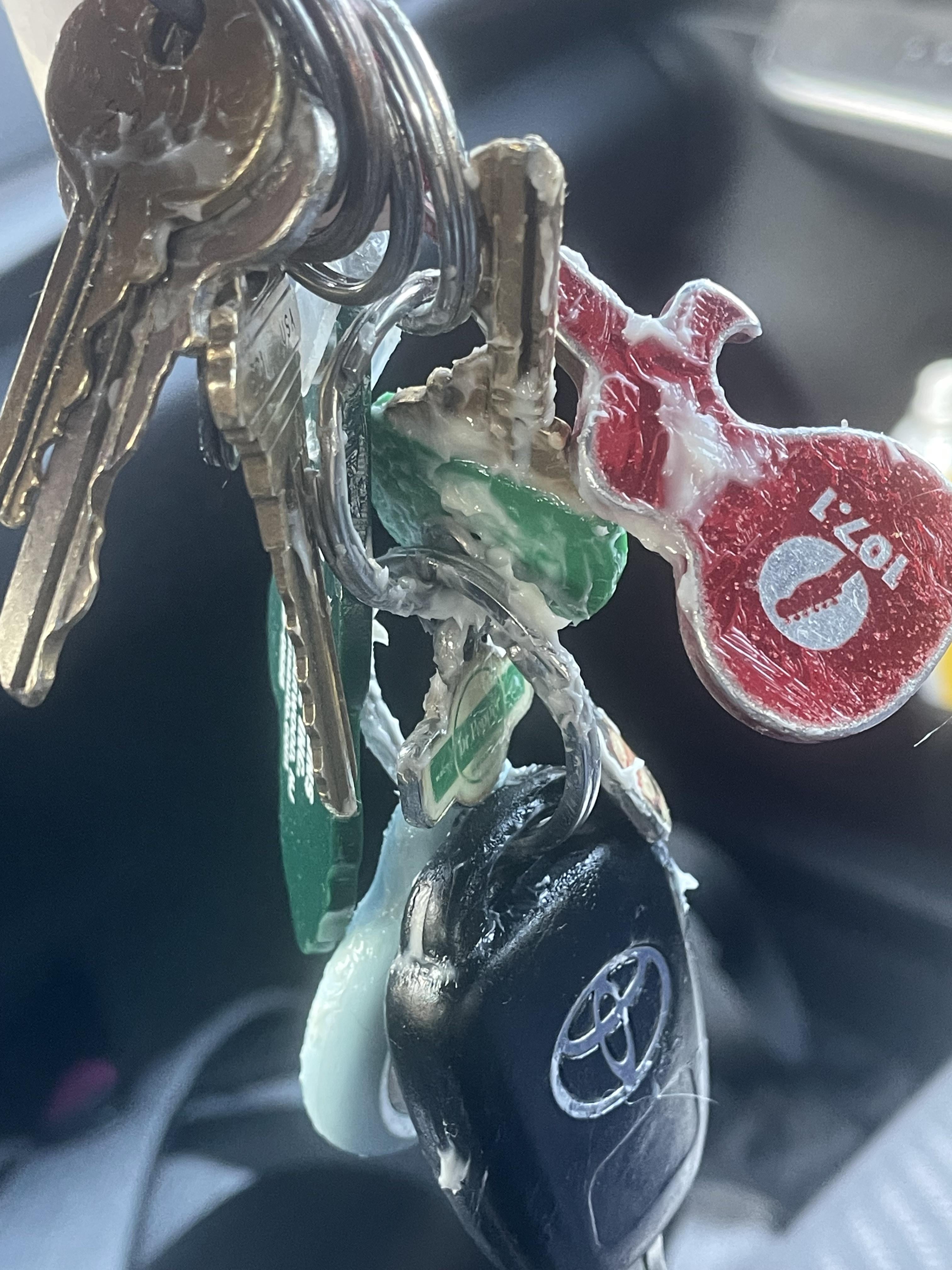 Pictured: someone else’s keys and unknown brand of butter (melted)