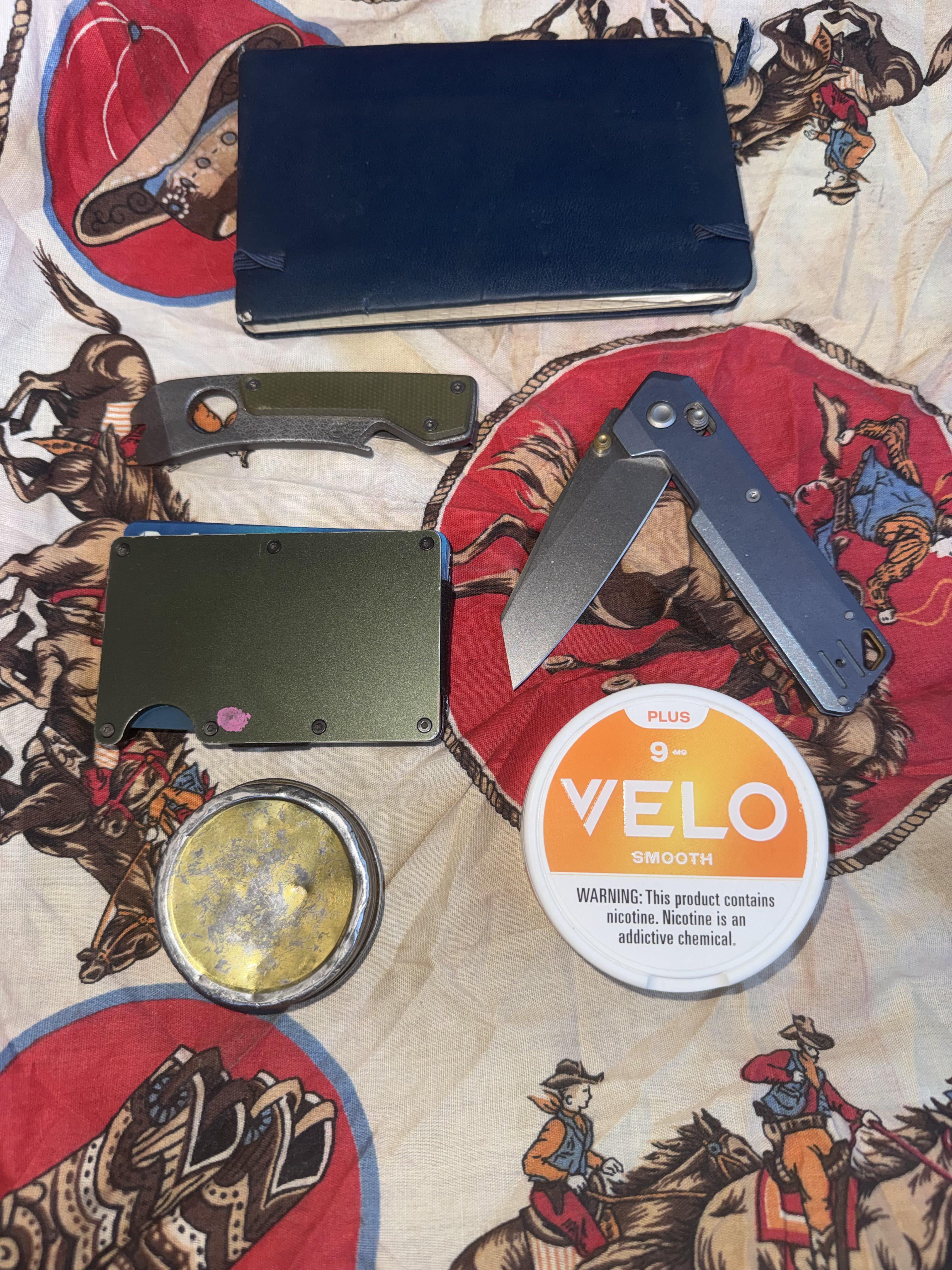 In EDC About as minimal as my work carry gets December 2, 2025 (Top) moleskine pocket notebook (Top left) Gerber Chonk (Middle left) knockoff ridge wallet (Lower left) sudden death moustache wax (Top right) Vosteed Parallel (Lower right) Velo nicotine pouches (Background) a bandanaby jdp_27_ EDC Prev Post Suisin Sujihiki December 2, 2025 Next Post Finally, a day off December 2, 2025 Related Posts He’s finally joined the family! My first 3-year-old skydiver! January 15, 2026 Here you go dirty Gunslingers! January 15, 2026 Just your average Thursday carry. January 15, 2026 1 Comment AutoModerator 1 month ago Thank you for posting to r/EDC! Include a detailed item list (make/model) within **1 hour** of submission. Lists can go in the title, a comment, or the image. Posts without lists will be removed. If you have already provided a list, not further action is needed, thanks | [FAQ](https://www.reddit.com/r/EDC/wiki/faq)*I am a bot, and this action was performed automatically. Please [contact the moderators of this subreddit](/message/compose/?to=/r/EDC) if you have any questions or concerns.*Write A CommentYou must be logged in to post a comment.