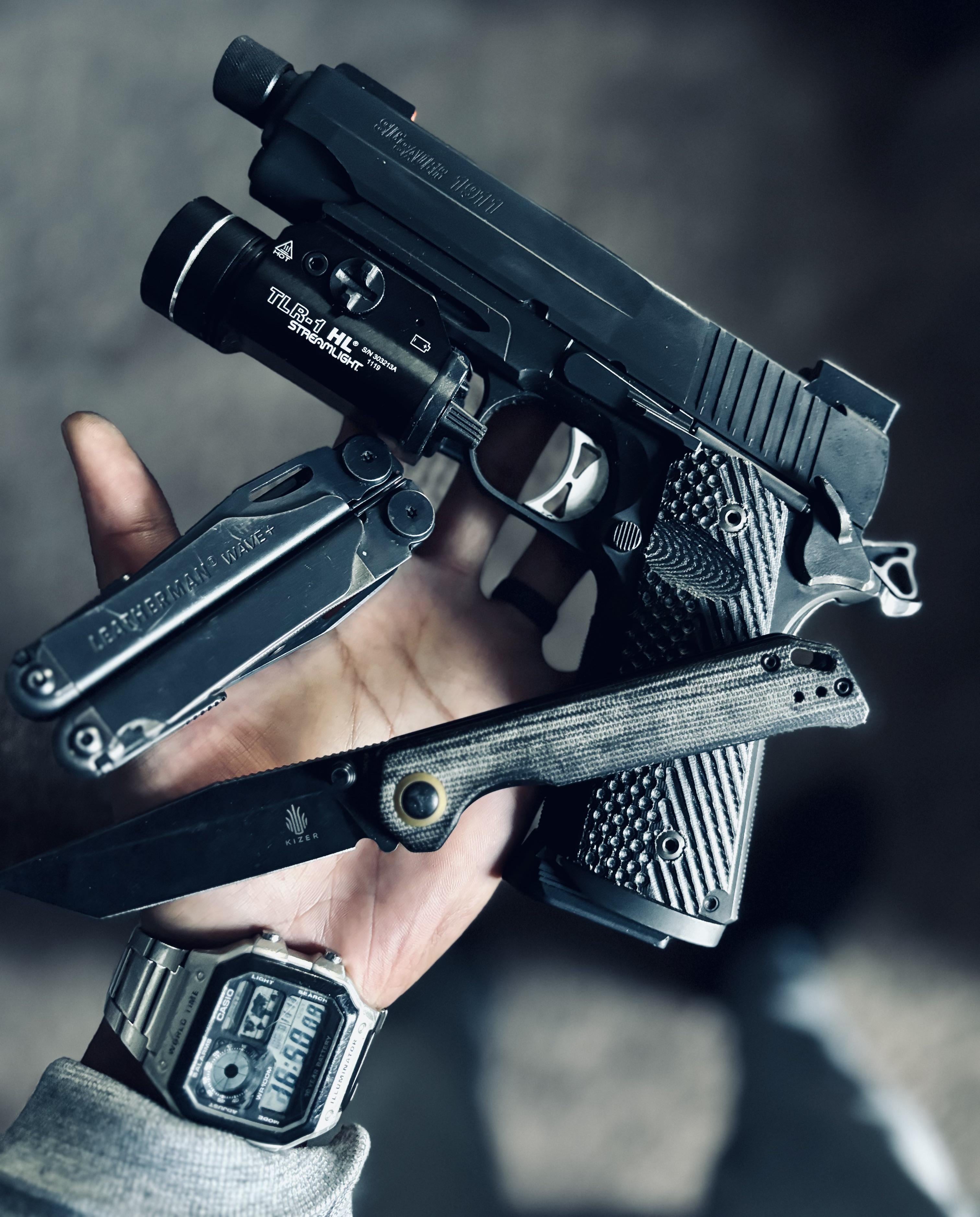 In EDC Gun and knife duo December 2, 2025 Sig 1911 tacops carry, leatherman wave+, Kizer begleiter and Casio AE1200WHD by InternationalGood17 EDC Prev Post Kershew bel-air December 2, 2025 Next Post A Different P16 Setup – Switchback HOG & Yellow Filter December 2, 2025 Related Posts Reconnaissance Light Carry March 3, 2026 Cross Country Move this Week March 3, 2026 Todays Carry March 3, 2026 2 Comments AutoModerator 3 months ago Thank you for posting to r/EDC! Include a detailed item list (make/model) within **1 hour** of submission. Lists can go in the title, a comment, or the image. Posts without lists will be removed. If you have already provided a list, not further action is needed, thanks | [FAQ](https://www.reddit.com/r/EDC/wiki/faq)*I am a bot, and this action was performed automatically. Please [contact the moderators of this subreddit](/message/compose/?to=/r/EDC) if you have any questions or concerns.* WavesOverBarcelona 3 months ago Duo?Write A CommentYou must be logged in to post a comment.
