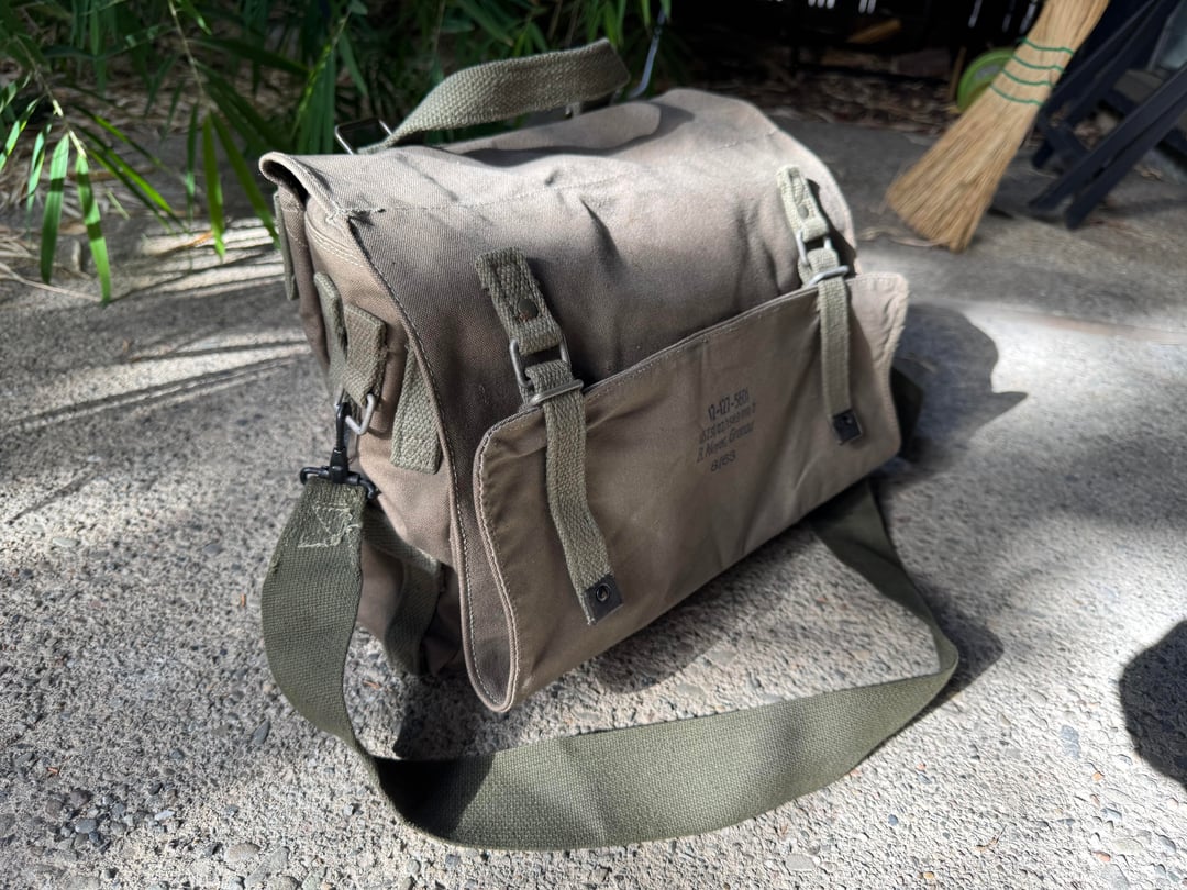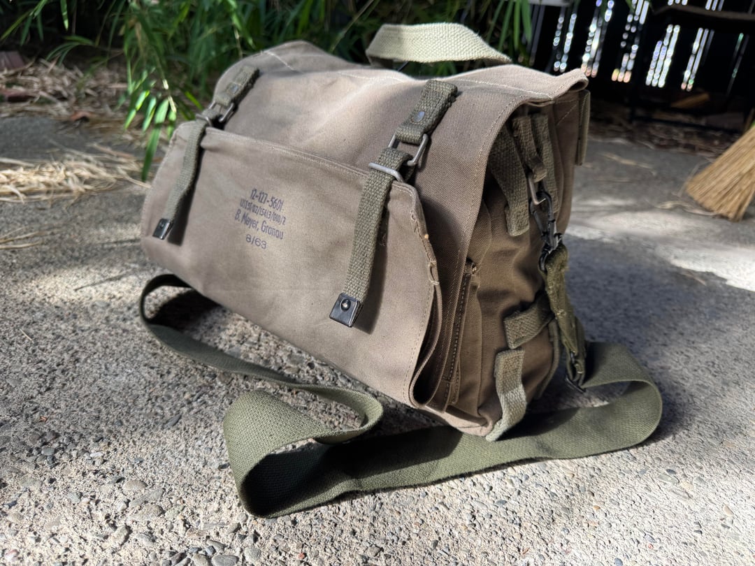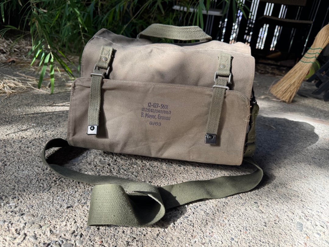 Who else loves combing thrift shops, and surplus stores for beer needing new homes? Found this one old American Eagle Y2K messenger bag, done up to look like an old school military musette set bag. And in an online thrift shop, I found this West German Bundeswehr shoulder bag. Both of them were in cherry condition, and received several treatments of Greenland wax. The AE bag got a couple snaps added to it to cinch up the sides where rain or splash water might get in.