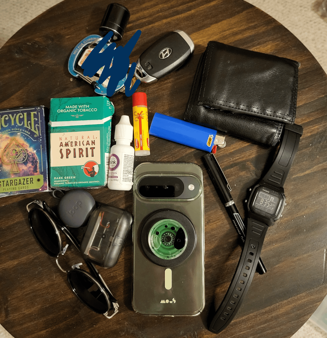 Deck of standard playing cards, half empty pack of American spirits, jlab headphones, loop hearing protection, sunglasses, pixel 10 cell phone, keys, wallet, blink contact lens eye drops, precision V5 pen, bic lighter, camex brand chapstick, and Casio watch.