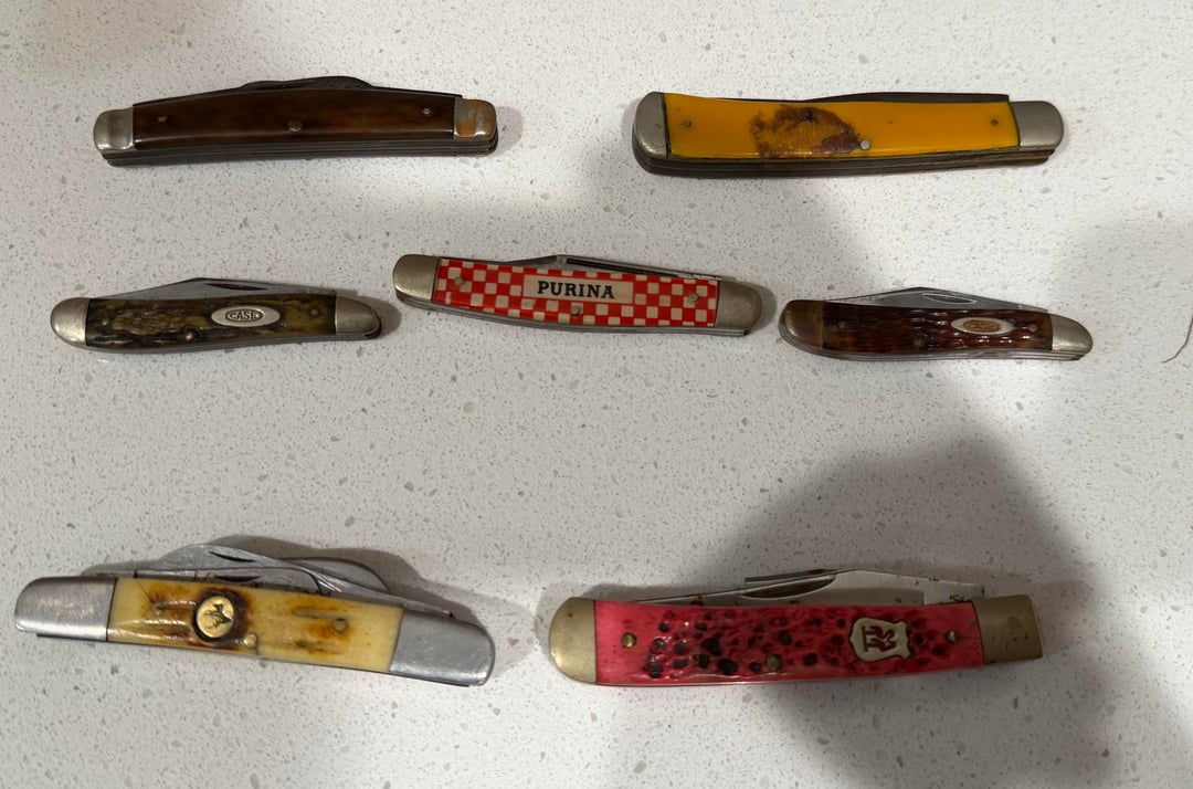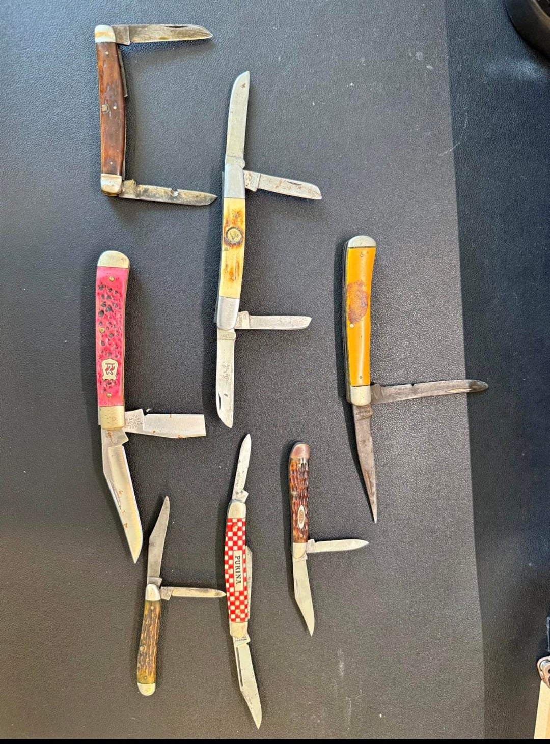 I bought this knife lot at a VERY good price on marketplace. I know some are past the point of return like the Kissing Crane Trapper but I do want to try and clean and mild restore them( especially the Cases)