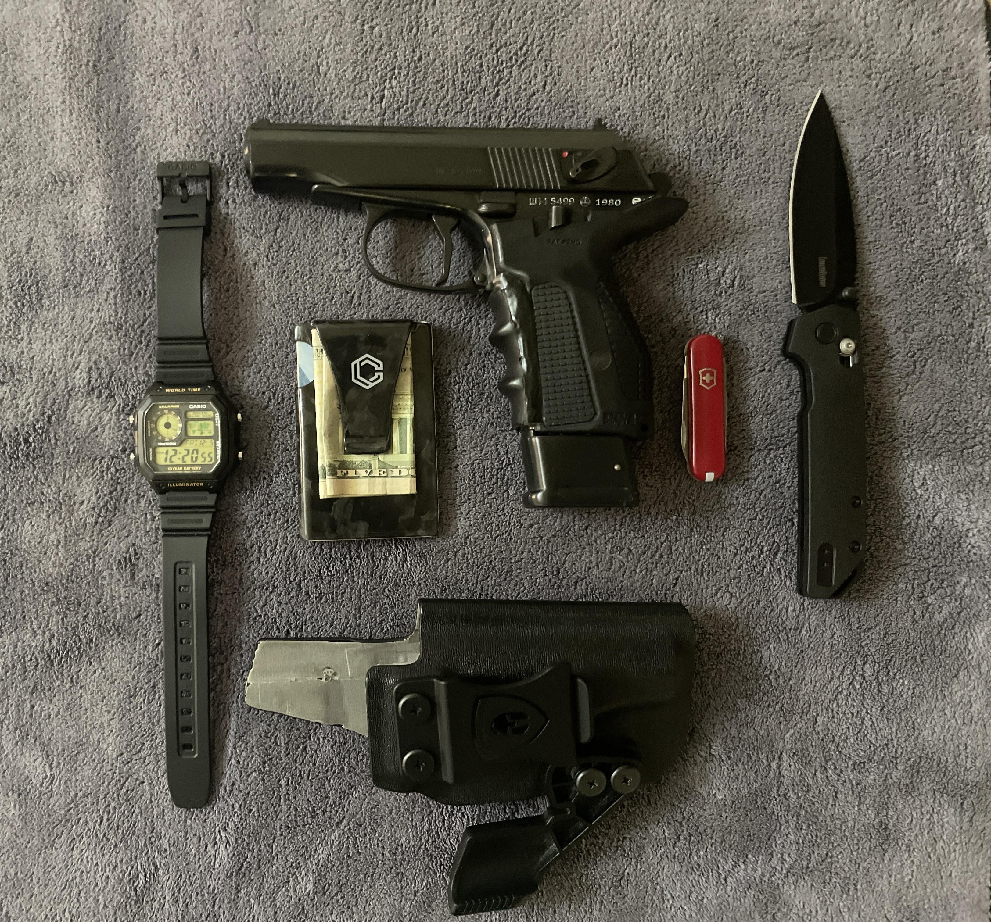 In EDC Friday Night December 5, 2025 1980 USSR MAKROV PM : -fab defense PMG grip -custom trigger -magazine extensionWarrior Land IWB kydex holsterKnives: -Kershaw Iridium -Victorinox Classic SDFored Carbon fiber wallet Casio AE 1200WH 1Bby Capital-Employ2858 EDC Prev Post What does my bag say about me? December 5, 2025 Next Post Which quick release key ring? Rovyvon a7🤩 December 5, 2025 Related Posts 3rd Shifter January 15, 2026 Here’s my flu season kit January 15, 2026 Mom of 3 EDC January 15, 2026 1 Comment AutoModerator 1 month ago Thank you for posting to r/EDC! Include a detailed item list (make/model) within **1 hour** of submission. Lists can go in the title, a comment, or the image. Posts without lists will be removed. If you have already provided a list, not further action is needed, thanks | [FAQ](https://www.reddit.com/r/EDC/wiki/faq)*I am a bot, and this action was performed automatically. Please [contact the moderators of this subreddit](/message/compose/?to=/r/EDC) if you have any questions or concerns.*Write A CommentYou must be logged in to post a comment.