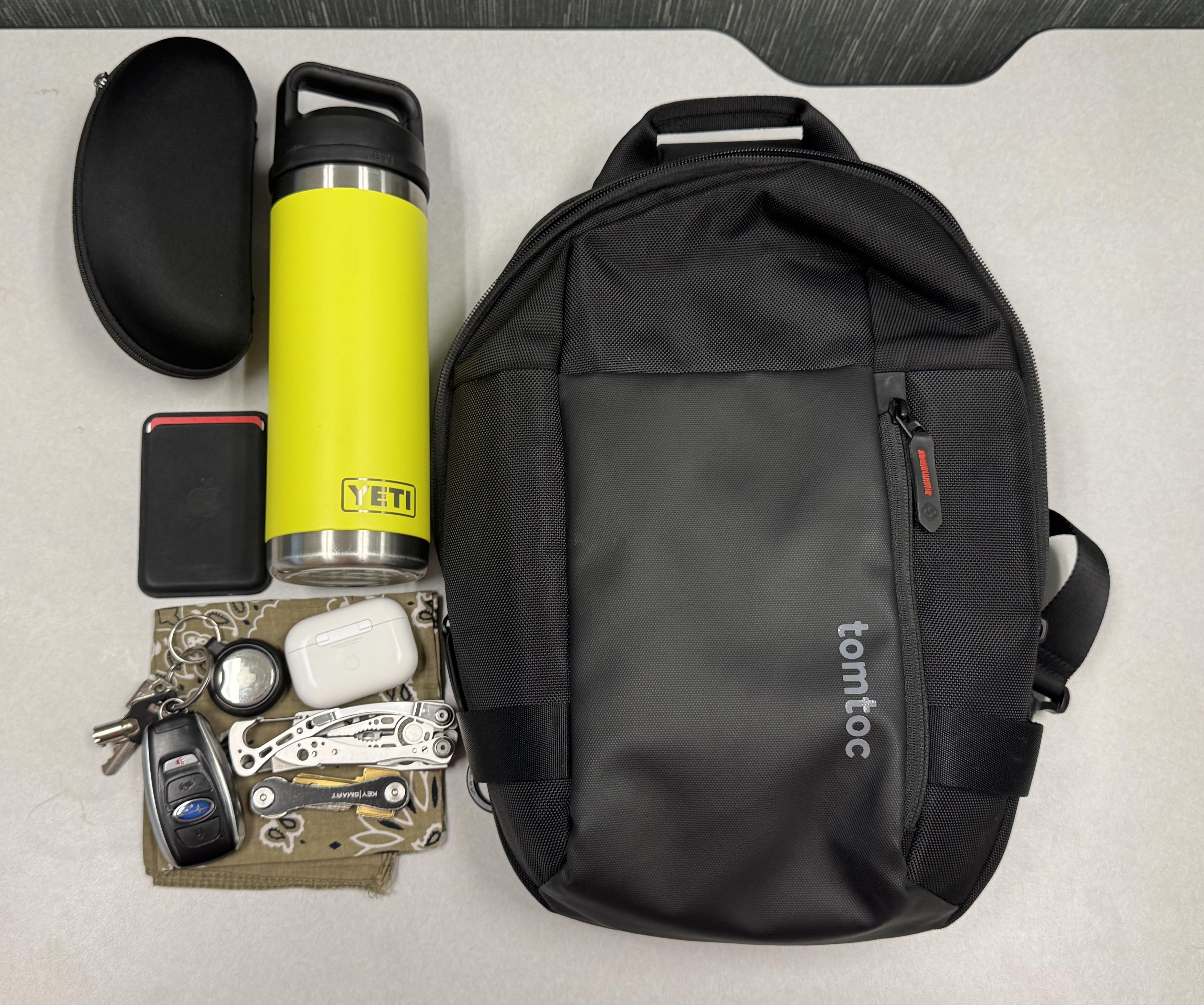 In EDC Friday Office Carry December 5, 2025 My usual Friday carry. Tomtoc sling, Yeti Rambler 18oz, Rx sunglasses, Apple Wallet, AirPod Pro 2, Leatherman Skeletool, car key, Keysmart Classic.Not pictured: Apple iPhone 15 Pro Max.by dolli310 EDC Prev Post Which is right. December 5, 2025 Next Post FET Friday! Testing the long tube on my copperception S2+ mule December 5, 2025 Related Posts Thurplesday January 15, 2026 The Day-to-Day Carry January 15, 2026 Snowmobile 1 Watch 0 January 15, 2026 1 Comment AutoModerator 1 month ago Thank you for posting to r/EDC! Include a detailed item list (make/model) within **1 hour** of submission. Lists can go in the title, a comment, or the image. Posts without lists will be removed. If you have already provided a list, not further action is needed, thanks | [FAQ](https://www.reddit.com/r/EDC/wiki/faq)*I am a bot, and this action was performed automatically. Please [contact the moderators of this subreddit](/message/compose/?to=/r/EDC) if you have any questions or concerns.*Write A CommentYou must be logged in to post a comment.