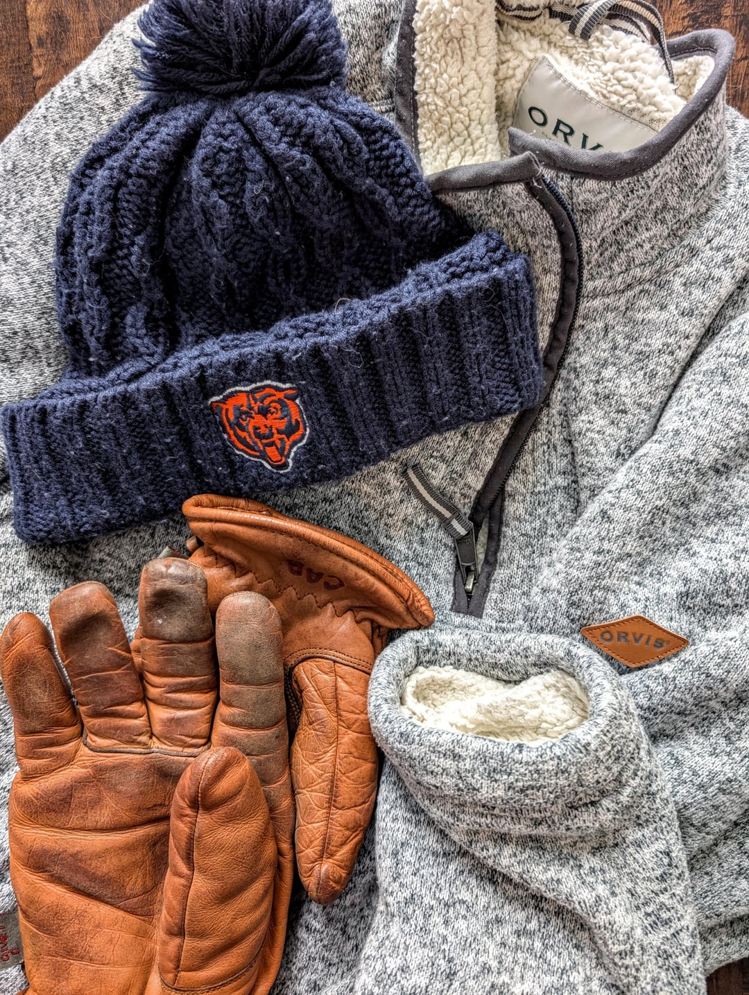 warm wool lined orvis fleece pull over, warm hat, give'r gloves and a hot coffee