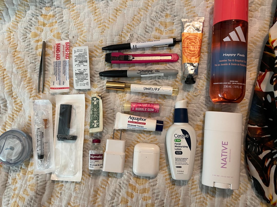 I see you are diabetic. Is the black square thingy for checking glucose? So because of your battle with diabetes you are prone to dry skin and dehydration, hence the hand creams and moisturizers. You also probably have some dis-regulation with body temperature which can cause sweating so you keep antiperspirant in your bag in. I was surprised you didn’t have some snacks or a drink in there for emergency. Not sure what the gray item on the left is. A collapsible cup maybe? No idea. Seems like you’ve got a handle on your condition though. The cutting tool, bandaid and tweezers tell me maybe you get splinters on the job. Maybe you work part time at Home Depot? That’s an absolute reach in narrative. This is all speculative.