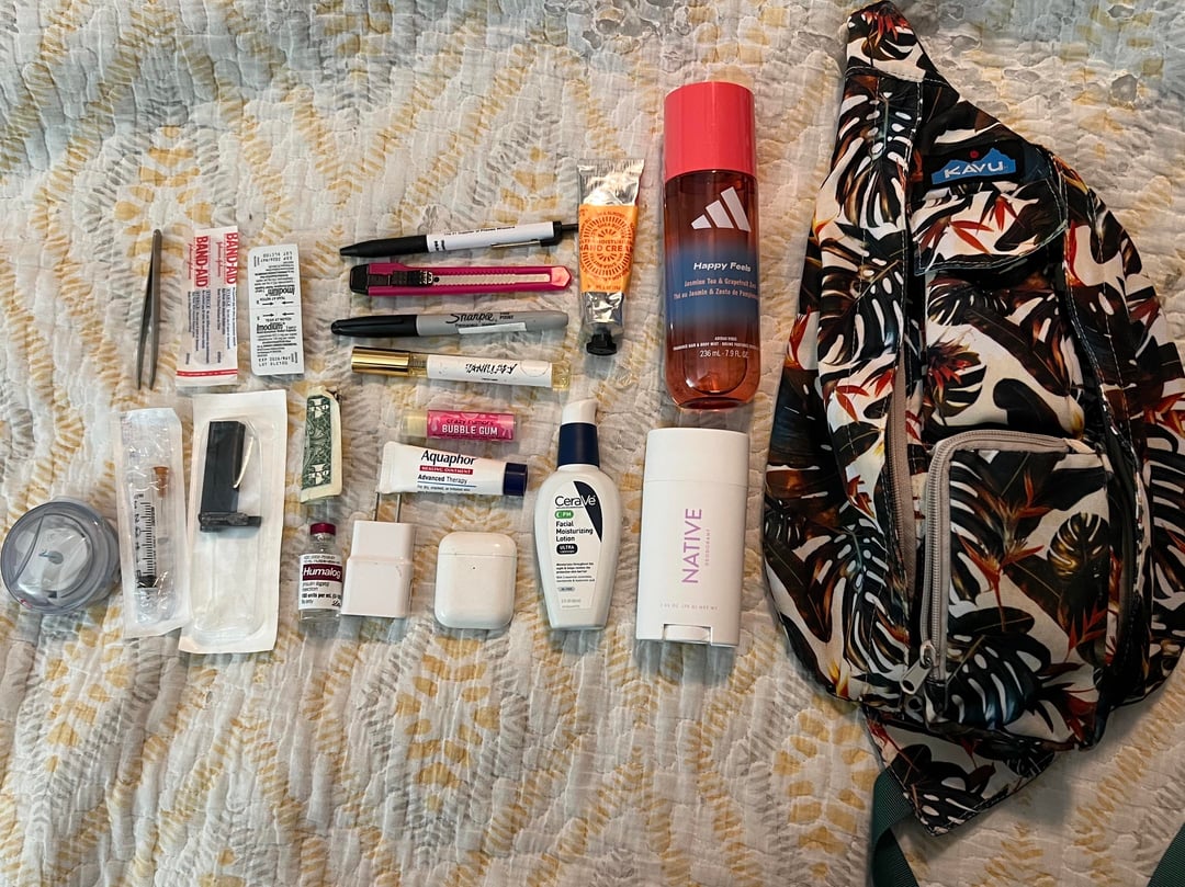 The full size deodorant and moisturizer, big ass perfume, plus a box cutter is sending me I love a prepared queen. You will Not be caught slipping. You give a kinda no nonsense vibe, but not in a negative way, just that you have shit to do so yes you’ll be tossing your essentials in the bag and being on your way.