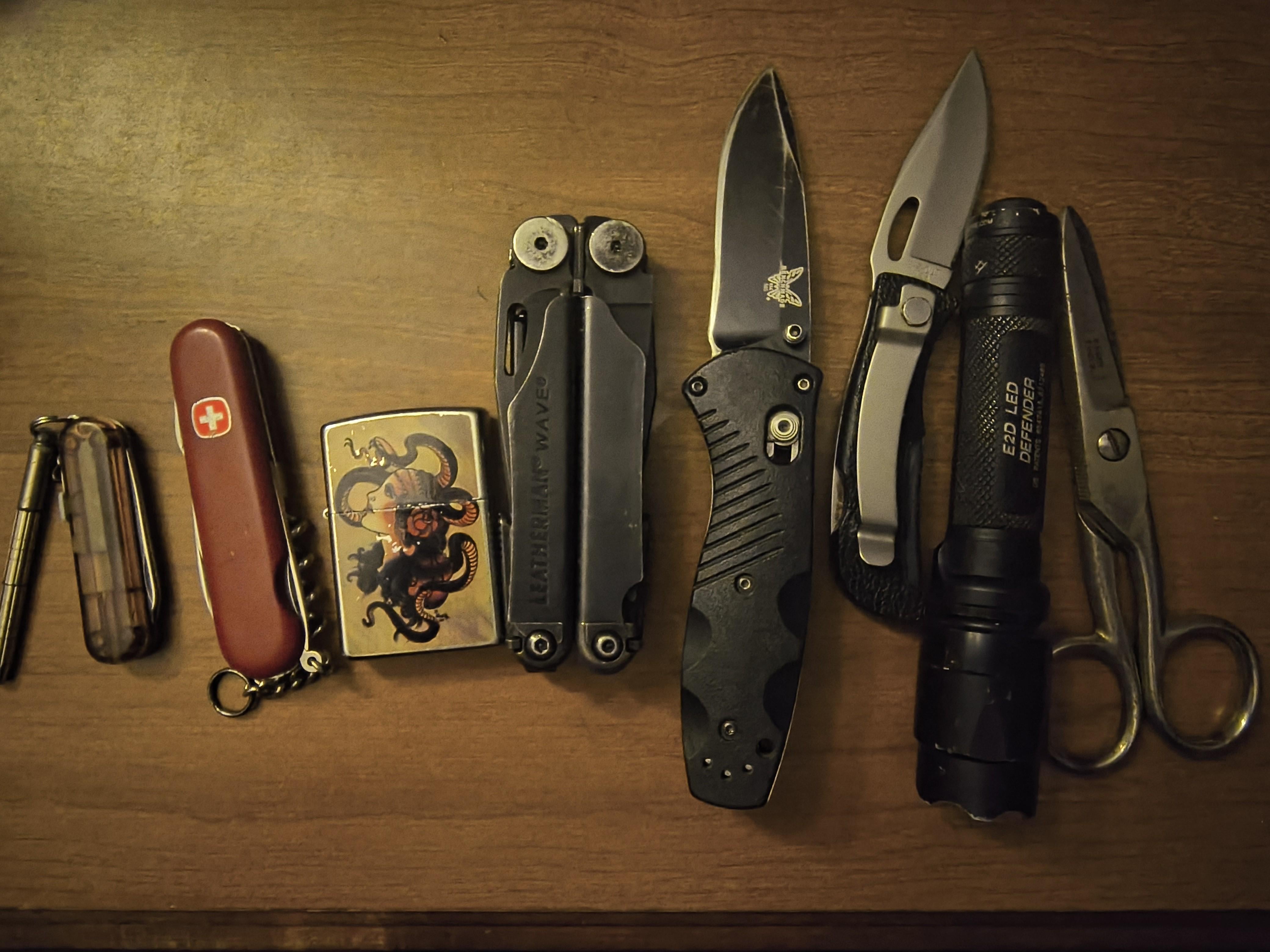58mm Victorinox / Wenger Viking / Zippo / Leatherman Wave / Benchmade mini Barrage / Gerber 425 E-Z Out / Surefire E2D LED Defender / Klein shears