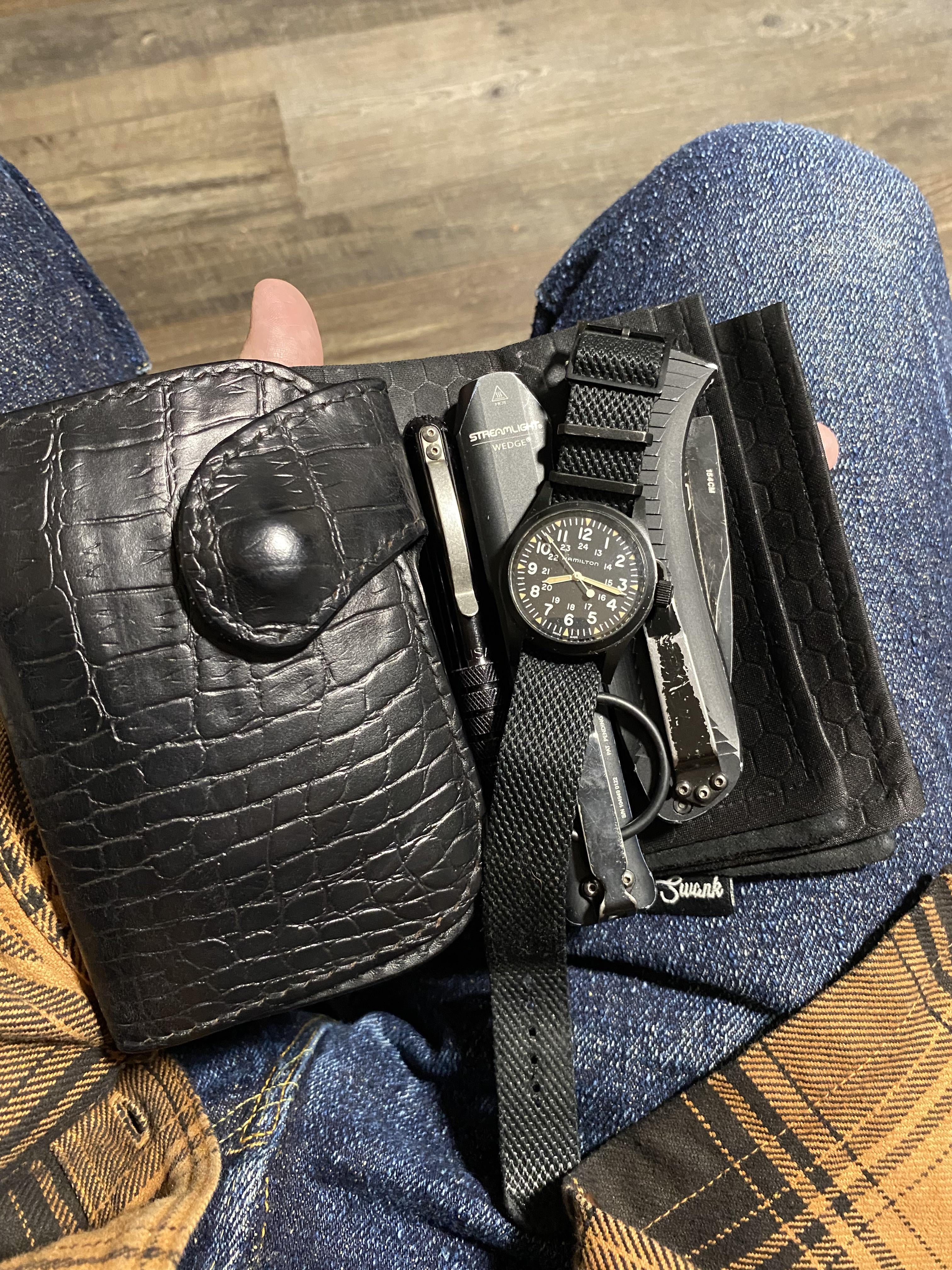In EDC Basics in black. December 6, 2025 Ewing dry goods wallet, Embassy pen, Streamlight wedge, Benchmade 5000, Hamilton khaki field mechanical. by Es_daily EDC Prev Post Going to die with a BB58 on my wrist December 6, 2025 Next Post EDC Check December 6, 2025 Related Posts Waiting in a salon for my son haircut March 3, 2026 My EDC – 2026 March 3, 2026 Wireman School March 3, 2026 2 Comments AutoModerator 3 months ago Thank you for posting to r/EDC! Include a detailed item list (make/model) within **1 hour** of submission. Lists can go in the title, a comment, or the image. Posts without lists will be removed. If you have already provided a list, not further action is needed, thanks | [FAQ](https://www.reddit.com/r/EDC/wiki/faq)*I am a bot, and this action was performed automatically. Please [contact the moderators of this subreddit](/message/compose/?to=/r/EDC) if you have any questions or concerns.* MrPocketjunk 3 months ago what about the shirt? info, please. 😄Write A CommentYou must be logged in to post a comment.