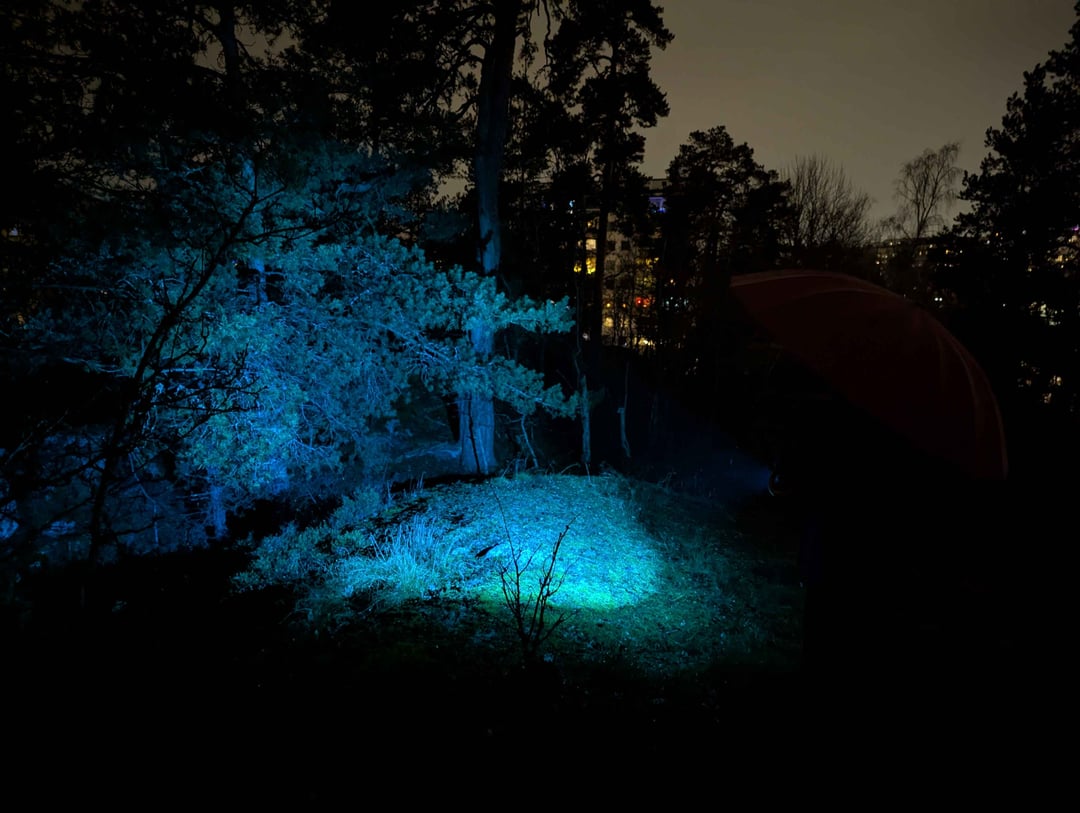 Pumping 3 amps with a linear driver to get a good amount of light, the zoomie gives both flood and throw. And with the emitter being somewhat monochrome there's not as much zoomie artifacts on the edges as you'd get with a white emitter.